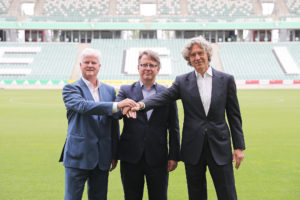 – od lewej: Martin Mellor – szef firmy Ericsson w Polsce, Jean Mark Harion prezes zarządu PLAY, Dariusz Mioduski prezes Legii Warszawa )
