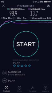 1. aplikacja mobilna speedtest.net, test transmisji danych Play w turystycznej Zawoi
