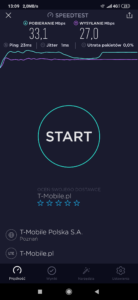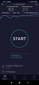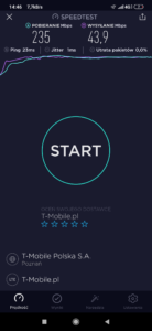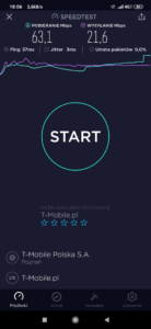 b) T-Mobile: wyniki testu w mobilnej wersji aplikacji speedtest.net
