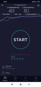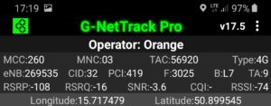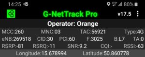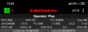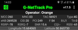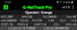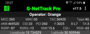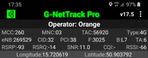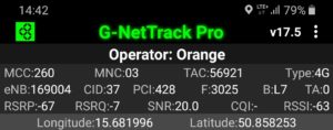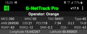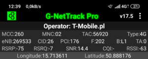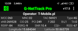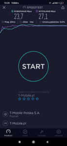 Zrzut ekranu, prezentujący stację, do której zalogował się terminal z kartą SIM w sieci Orange informuje, iż nie było to logowanie do stacji logicznej względem jego pobytu. Kluczem przejęcia terminala jest priorytetowe pasmo LTE2600. Ma to jednak swój skutek: relacja odległości od terminala przekłada się na zdecydowanie inną wartość transmisji danych, aniżeli możemy zauważyć przy teście, który prezentuje wyniki w sieci T-Mobile