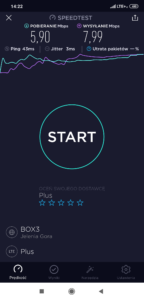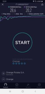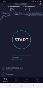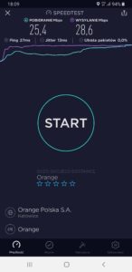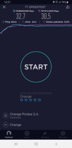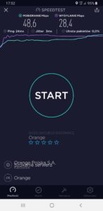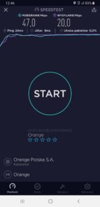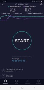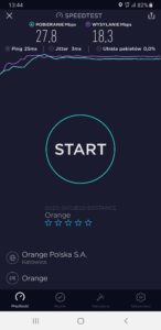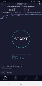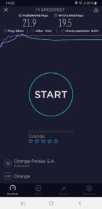 b) Orange: wyniki testu w mobilnej wersji aplikacji speedtest.net