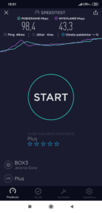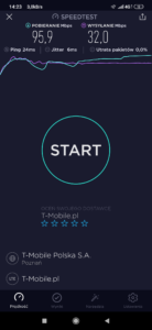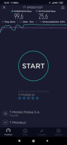 Terminal z kartą SIM w sieci T-Mobile korzysta z adekwatnej stacji względem swojego położenia. Warto jednak zwrócić uwagę na to, iż poziom transmisji download jest znacznie niższy, aniżeli, aniżeli w lokalizacjach wymienionych wcześniej. Prawdopodobnie jest to wynik korzystania przez operatorów Networks! w tej lokalizacji z transmisji linii radiowej, w przeciwieństwie do światłowodu, wykorzystywanego przy okazji większości stacji w mieście