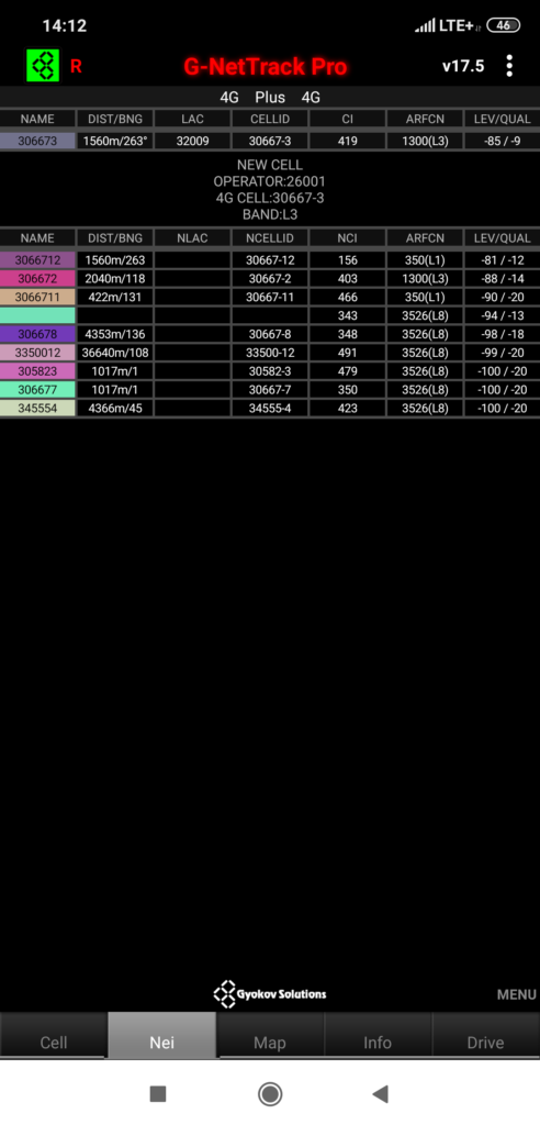 Sąsiedztwa ustalone przez terminal dla testowanej komórki w stacji Plusa: