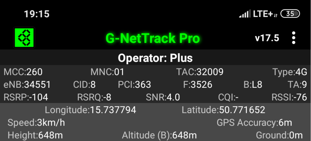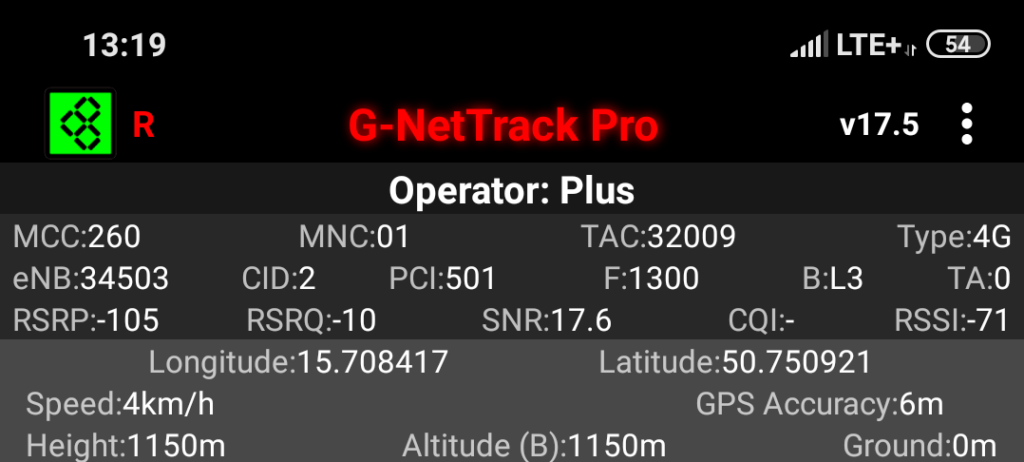 b) plik logu dla sieci Plus ze szlaku ( kolor czcionki granatowy oznacza zalogowanie terminala do stacji zupełnie irracjonalnych, co nie pozwala na skorzystanie z usług. Kolor czcionki wytłuszczony czarny oznacza zalogowanie do komórek 2G, zaś kolor czerwony przebywanie terminala poza zasięgiem sieci. Jako dopuszczalną odległość dla obsługi terminala w sieci LTE założyliśmy w tym przypadku odległość 20 kilometrów, stąd nawet stacje z Jeleniej Góry i pobliskiego Jeżowa Sudeckiego są oznaczone tak, jakby były stacjami, które mogą obsługiwać ruch dla terminali, zlokalizowanych w górach. Realnie to nie jest jednak sytuacja właściwa w przypadku, kiedy operator stacje w górach posiada, ale wymagają one realizacji korekt sprzętowych, parametryzacyjnych bądź doposażenia w kolejne sektory. W obecnej sytuacji, oprócz kroków, na które wskazujemy w bieżącym tekście – Plus powinien zainteresować się wybudowaniem stacji na szczycie Śnieżki oraz rozbudową do czwartego sektora i LTE1800 stacji BT30660 w miejscowości Karpniki