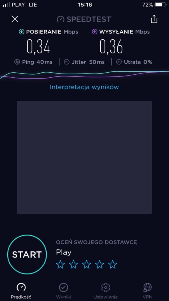 W drodze od restauracji SPOT, w kierunku autostrady A2, stojąc w korku możemy cieszyć się internetem Play z prędkością, jak na zrzucie ekranu: