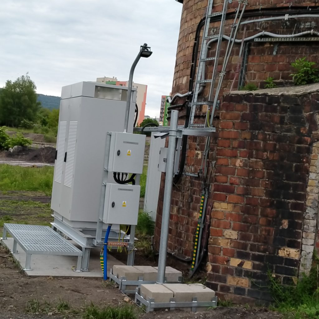 Poniżej zdjęcia komina, na którym buduje się nowa stacja Plusa. Na dole zamontowano już szafkę outdoor, na samym kominie zaś są tylko wsporniki. Jak wspominaliśmy wcześniej – anteny Plusa będą nieco wyżej niż zestawy podmiotów Networks! Na szczycie komina znajduje się instalacja Play
