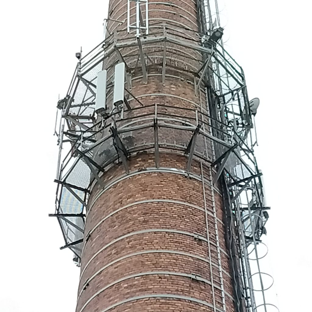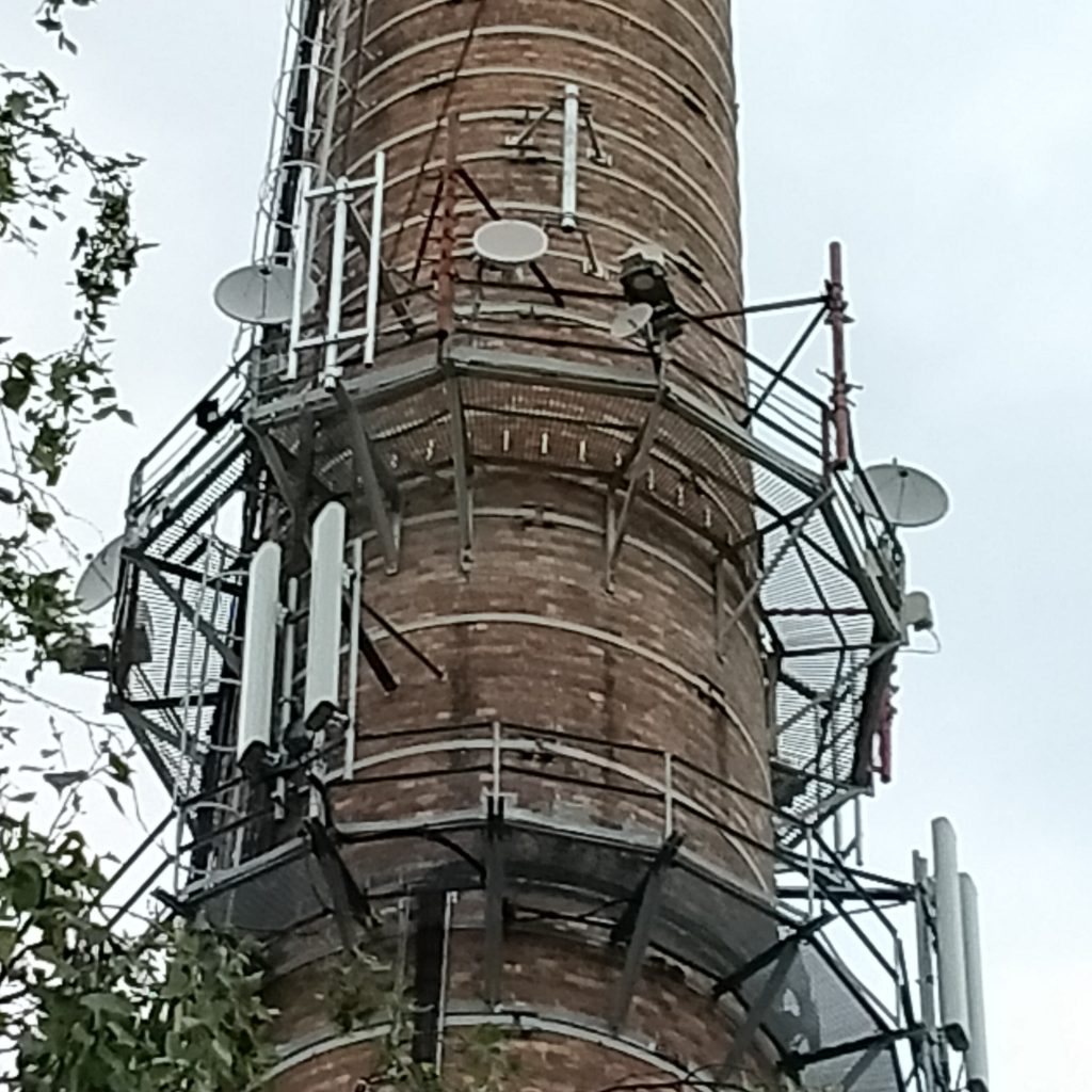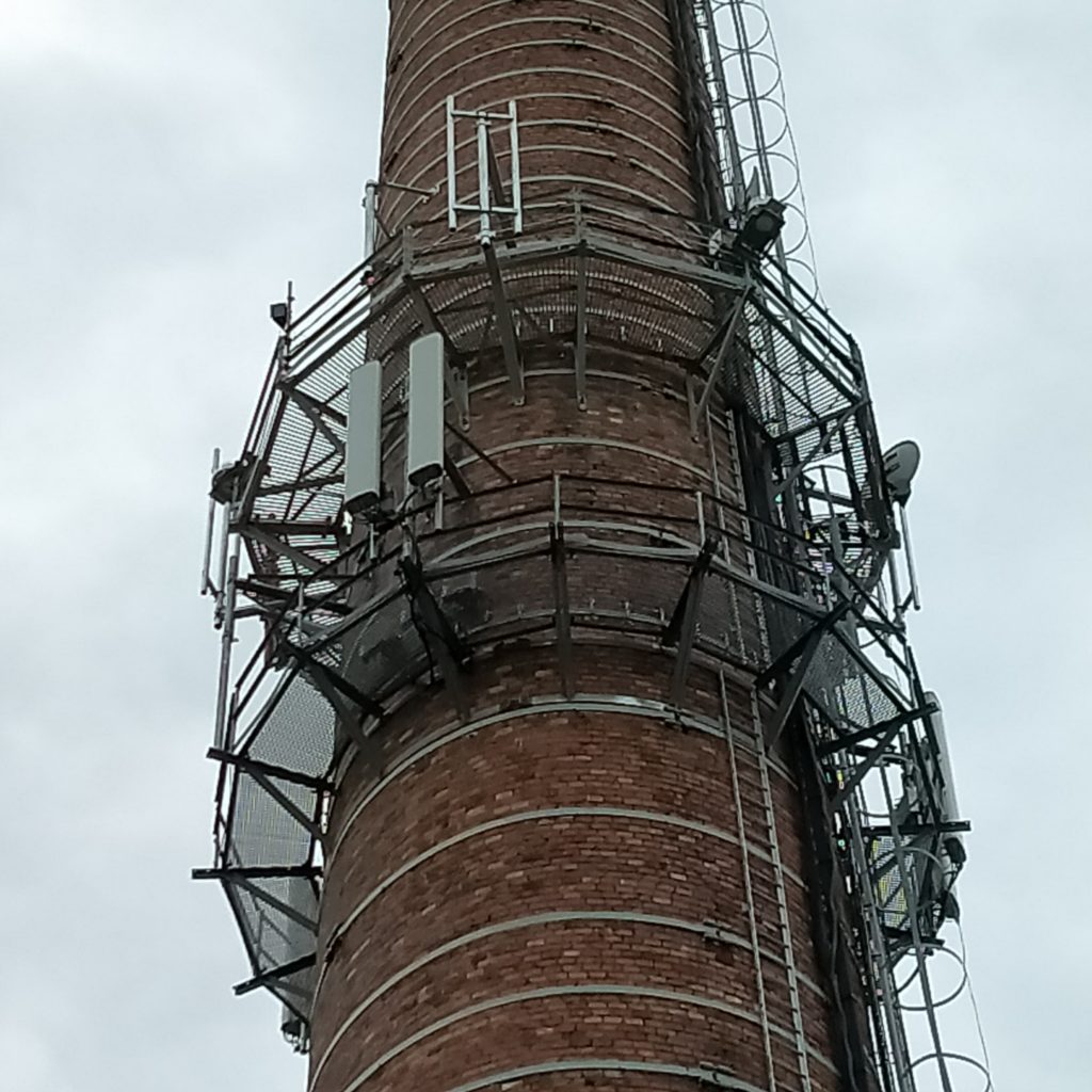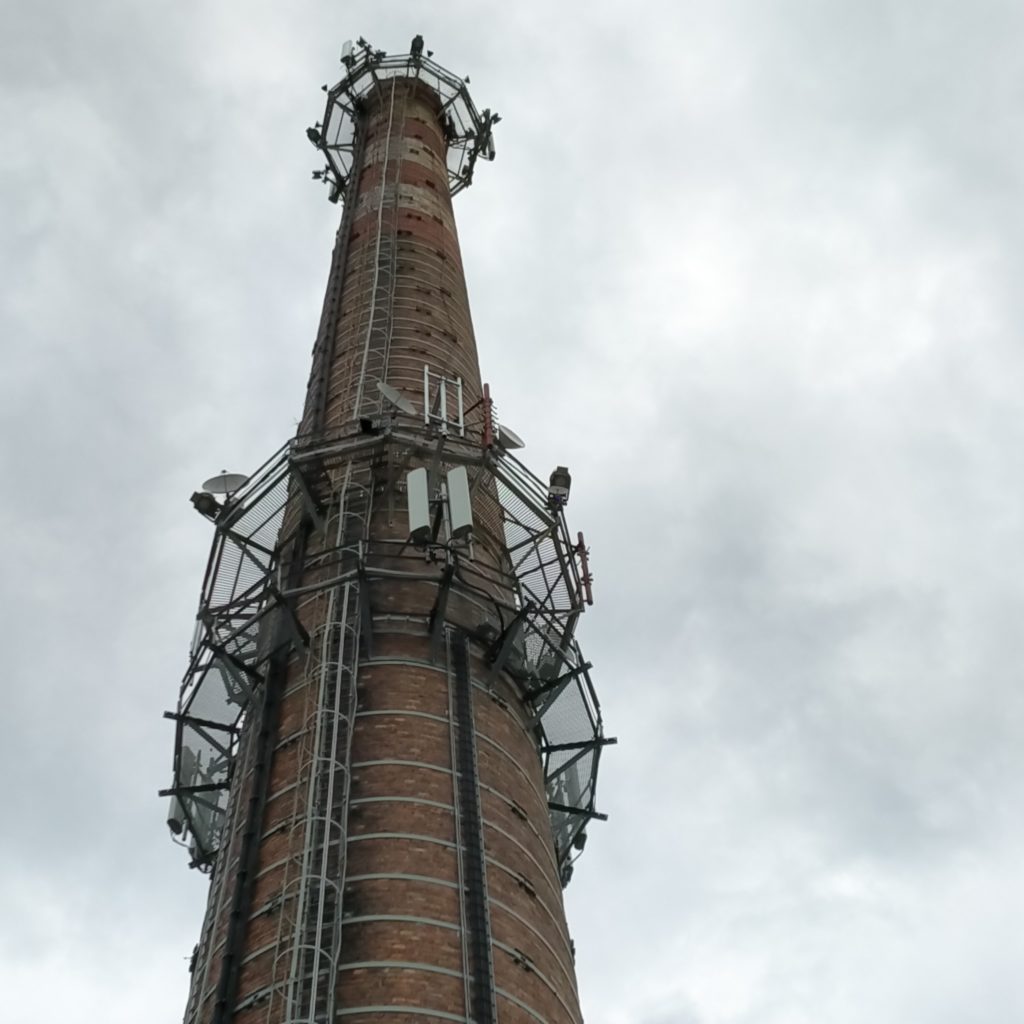 Poniżej zdjęcia komina, na którym buduje się nowa stacja Plusa. Na dole zamontowano już szafkę outdoor, na samym kominie zaś są tylko wsporniki. Jak wspominaliśmy wcześniej – anteny Plusa będą nieco wyżej niż zestawy podmiotów Networks! Na szczycie komina znajduje się instalacja Play