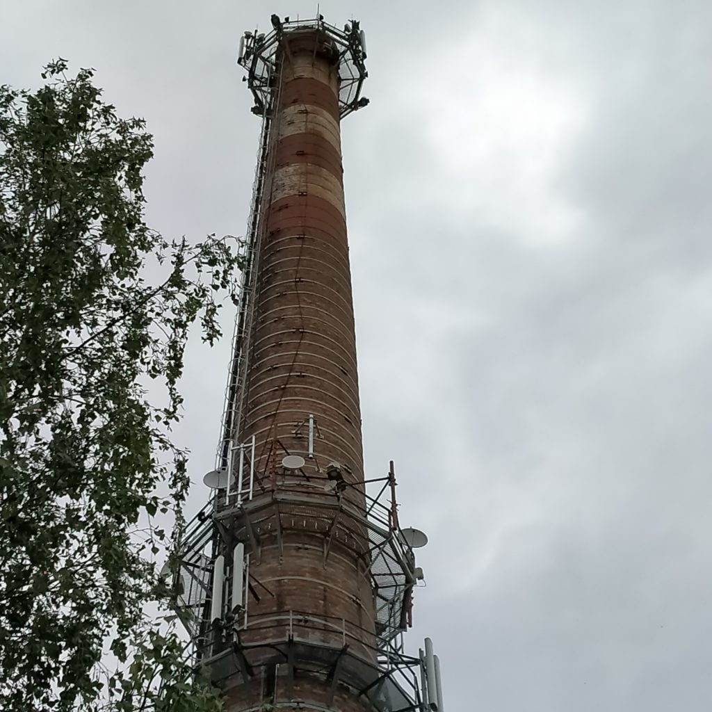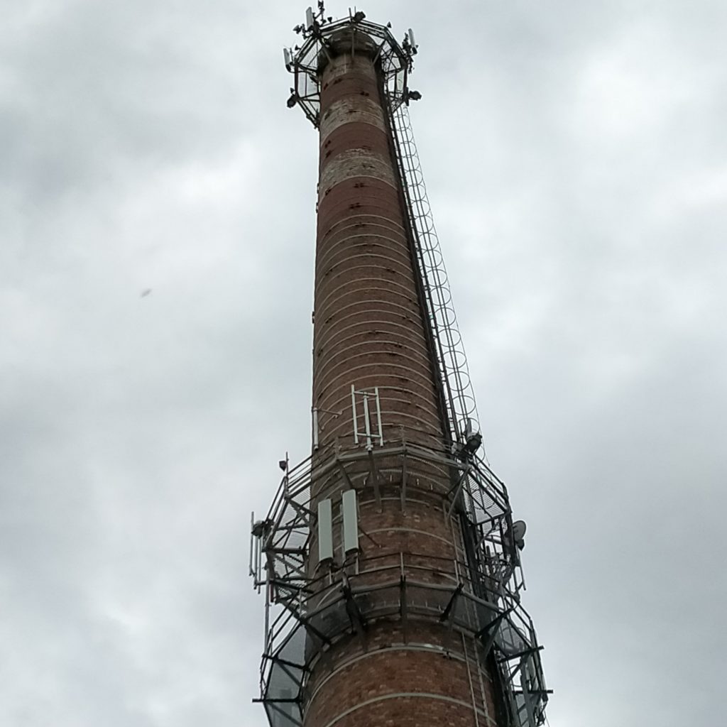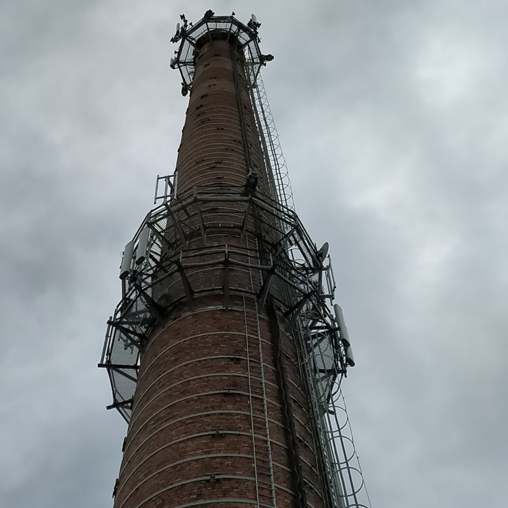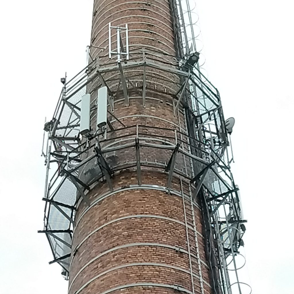 Poniżej zdjęcia komina, na którym buduje się nowa stacja Plusa. Na dole zamontowano już szafkę outdoor, na samym kominie zaś są tylko wsporniki. Jak wspominaliśmy wcześniej – anteny Plusa będą nieco wyżej niż zestawy podmiotów Networks! Na szczycie komina znajduje się instalacja Play
