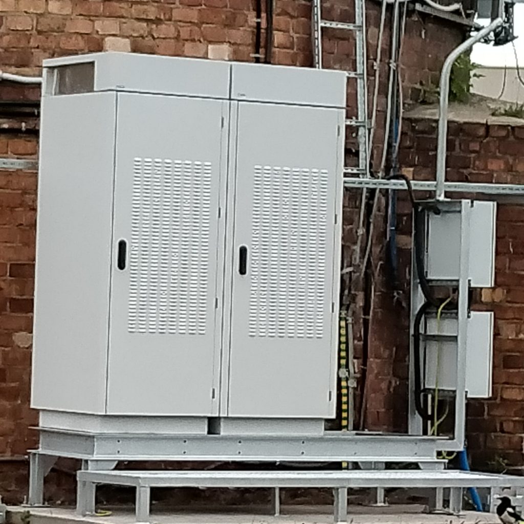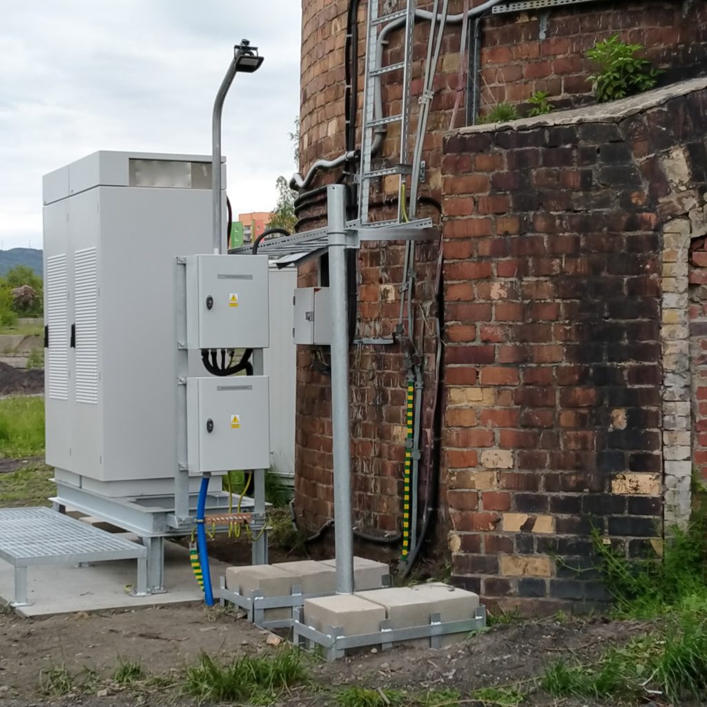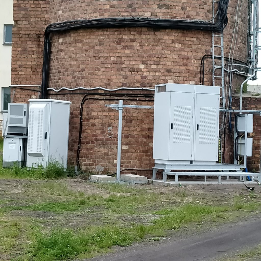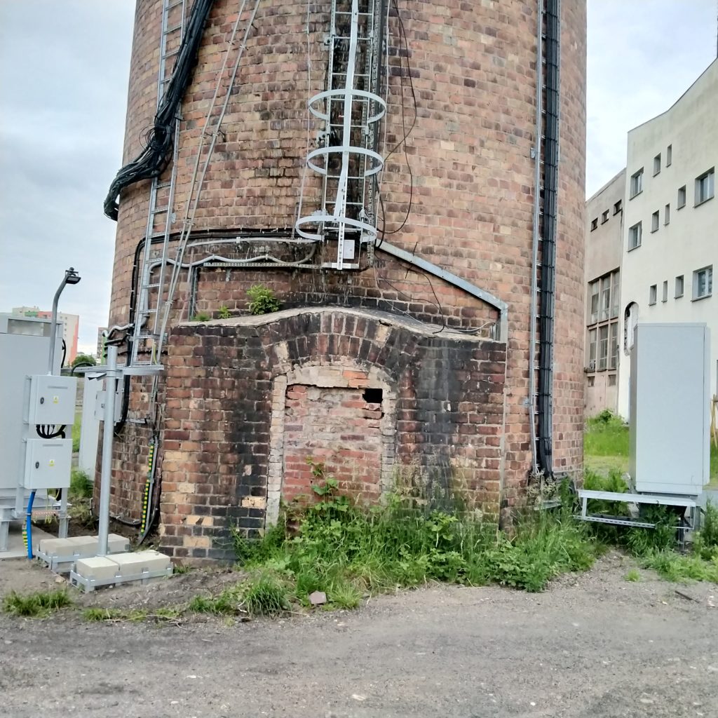 Poniżej zdjęcia komina, na którym buduje się nowa stacja Plusa. Na dole zamontowano już szafkę outdoor, na samym kominie zaś są tylko wsporniki. Jak wspominaliśmy wcześniej – anteny Plusa będą nieco wyżej niż zestawy podmiotów Networks! Na szczycie komina znajduje się instalacja Play