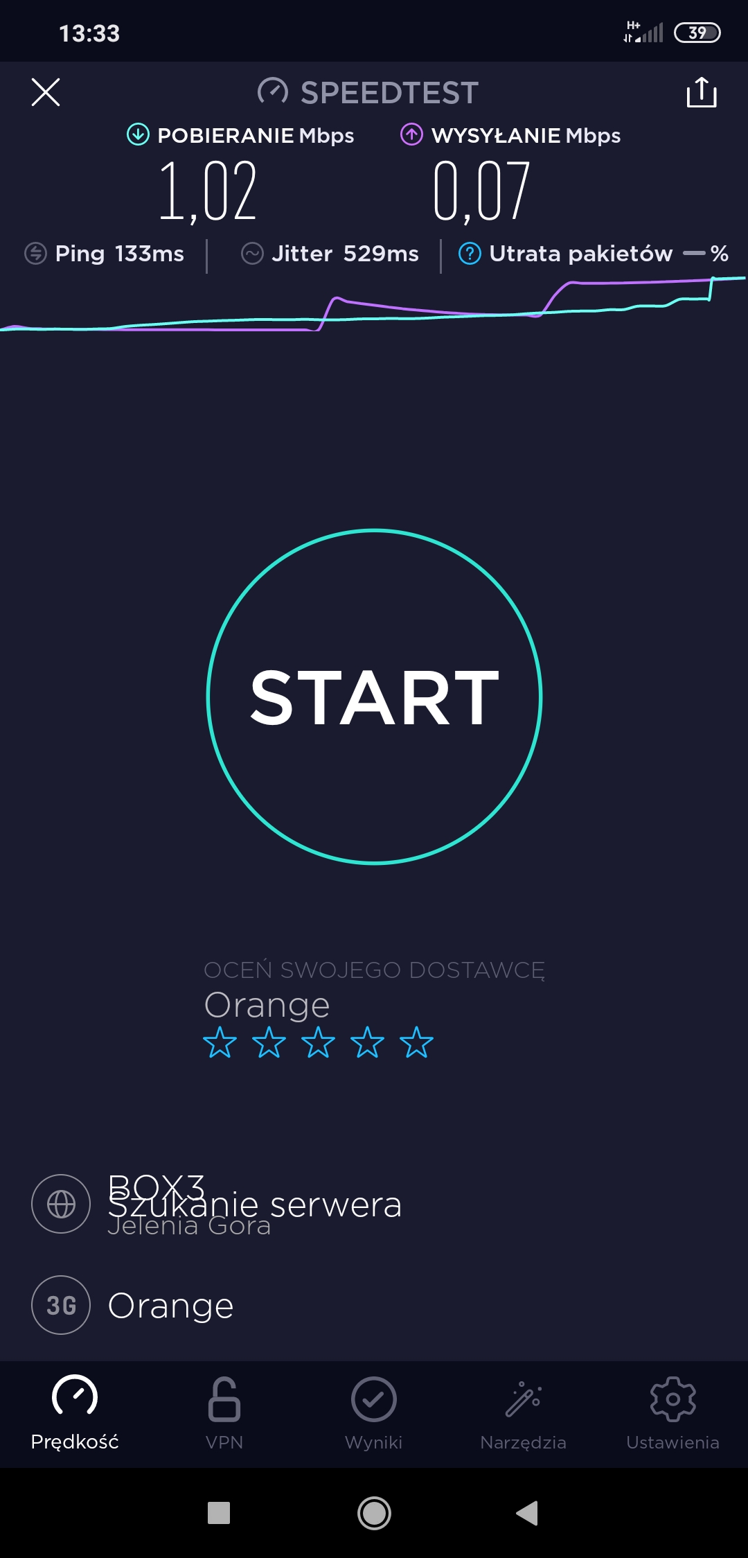 Wynik speedtest Orange przy schronisku „Chatka Górzystów”. U pozostałych operatorów wielokrotne próby realizacji testu się nie powiodły. Natomiast wewnątrz schroniska „Chatka Górzystów” u każdego z operatorów zobaczymy na wyświetlaczu komunikat „No service”