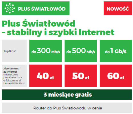 Plus Światłowód w odświeżonej ofercie! Plus odświeża swoją ofertę szybkiego i stabilnego Internetu stacjonarnego. Od poniedziałku 24 sierpnia obniżone zostają ceny wszystkich abonamentów usługi Plus Internet Stacjonarny realizowanej w oparciu o infrastrukturę Netii oraz w ramach zawartej umowy wydłużony zostaje do trzech miesięcy okres bezpłatnego korzystania.