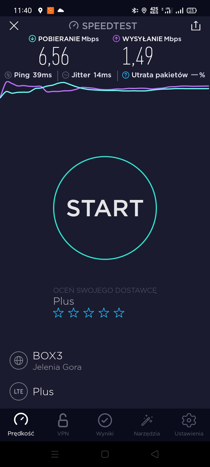 1. ul. Sobieskiego 53. Pod stacją BT33473. Terminal uzyskuje sygnał ze stacji BT30122, odległej o około 2 km, która posiada priorytetowe LTE1800, zaś w planach jest jej doposażenie do LTE2600 już niebawem. Z kolei stacja, pod którą realizujemy pomiar (BT33473), w sąsiedztwie rozwidlenia dwóch dróg krajowych i dwóch szlaków kolejowych (do dwóch granic Państwa: Zgorzelec [Niemcy] oraz Jakuszyce [Czechy], w sąsiedztwie kompleksu hurtowni, dwóch osiedli mieszkaniowych oraz biurowców Krajowej Administracji Skarbowej jest wyposażona zaledwie w GSM/UMTS900/LTE900