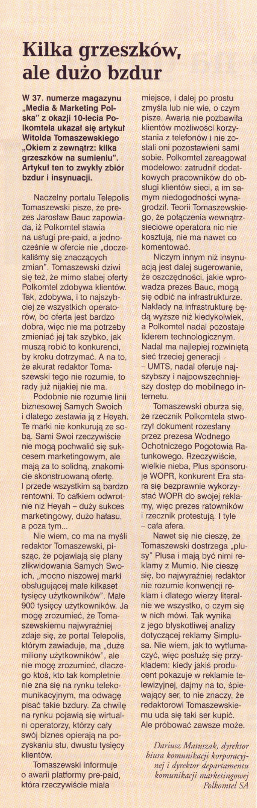 W naszych archiwach odnaleźliśmy kolejną „ciekawostkę”, związaną z działalnością sieci komórkowych. Tym razem, to materiał z okazji 10-lecia sieci komórkowych w postaci reakcji sieci Plus na materiał ówczesnego redaktora naczelnego Telepolis.pl – Witolda Tomaszewskiego. Pozostawiamy go bez komentarza