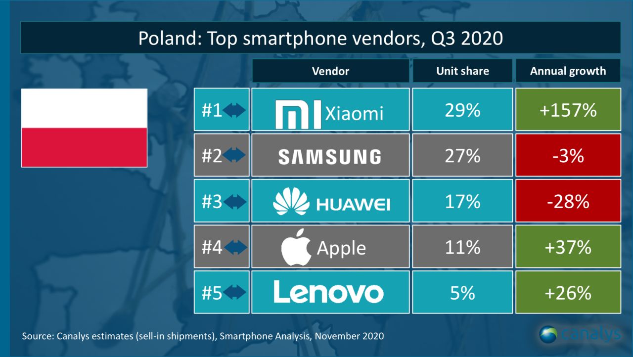 Xiaomi na pierwszym miejscu w sprzedaży smartfonów w Polsce. Jak informuje na portalu LinkedIn firma Xiaomi, powołując się na analizy serwisu Canalys – w trzecim kwartale 2020 roku znów uzyskała palmę pierwszeństwa pod względem ilości sprzedanych smartfonów w Polsce. Udział w rynku chińskiego producenta wyniósł 29%. Porównując rok do roku sprzedaż na rynku polskim wzrosła o 159%! W regionie Europy Wschodniej i Centralnej udział Xiaomi w sprzedaży smartfonów wynosi 27% (2 miejsce), zaś wzrost sprzedaży w porównaniu rok do roku wynosi 80%. W całej Europie Xiaomi pozostaje na trzecim miejscu, z z udziałem rynkowym 19%. Rok do roku również przyniósł wzrost sprzedaży i jest to ekwiwalent 90%.