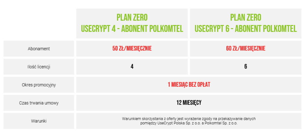 UseCrypt Messenger jest wyposażony w tzw. panic code, po wpisaniu którego usuwane są wszystkie dane z komunikatora znajdujące się na telefonie. Z UseCrypt Messengerem jesteś więc zabezpieczony także wtedy, gdy (w jakiejkolwiek niespodziewanej sytuacji) będziesz zmuszony wprowadzić hasło (enter code) do aplikacji. Aby móc w pełni korzystać z usługi, osoba, z którą chcemy się skontaktować również musi posiadać aplikację UseCrypt Messenger. Od listopada dostępna jest specjalna promocja dla klientów Plusa, dzięki której mogą korzystać z UseCrypt za 50 zł miesięcznie (4 licencje) lub za 60 zł miesięcznie (6 licencji), podczas gdy standardowa oferta w sklepach z aplikacjami to 64,99 zł miesięcznie za jedną licencję.