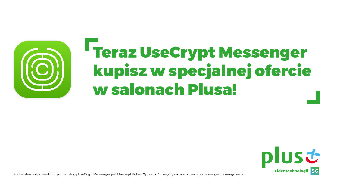 UseCrypt Messenger w ofercie Plusa. Pierwsza aplikacja, która sprawdza czy Twój telefon nie został zhakowany. Bezpieczeństwo komunikacji ma teraz wielkiego sojusznika. UseCrypt Messenger to najbardziej bezpieczny komunikator na telefony z systemami Android i iOS. Posiada własny system, który umożliwia szyfrowanie połączeń i wiadomości w standardzie HD. Sprawdza też czy telefon nie jest zhakowany. Od listopada usługa jest dostępna w specjalnej ofercie Plusa.