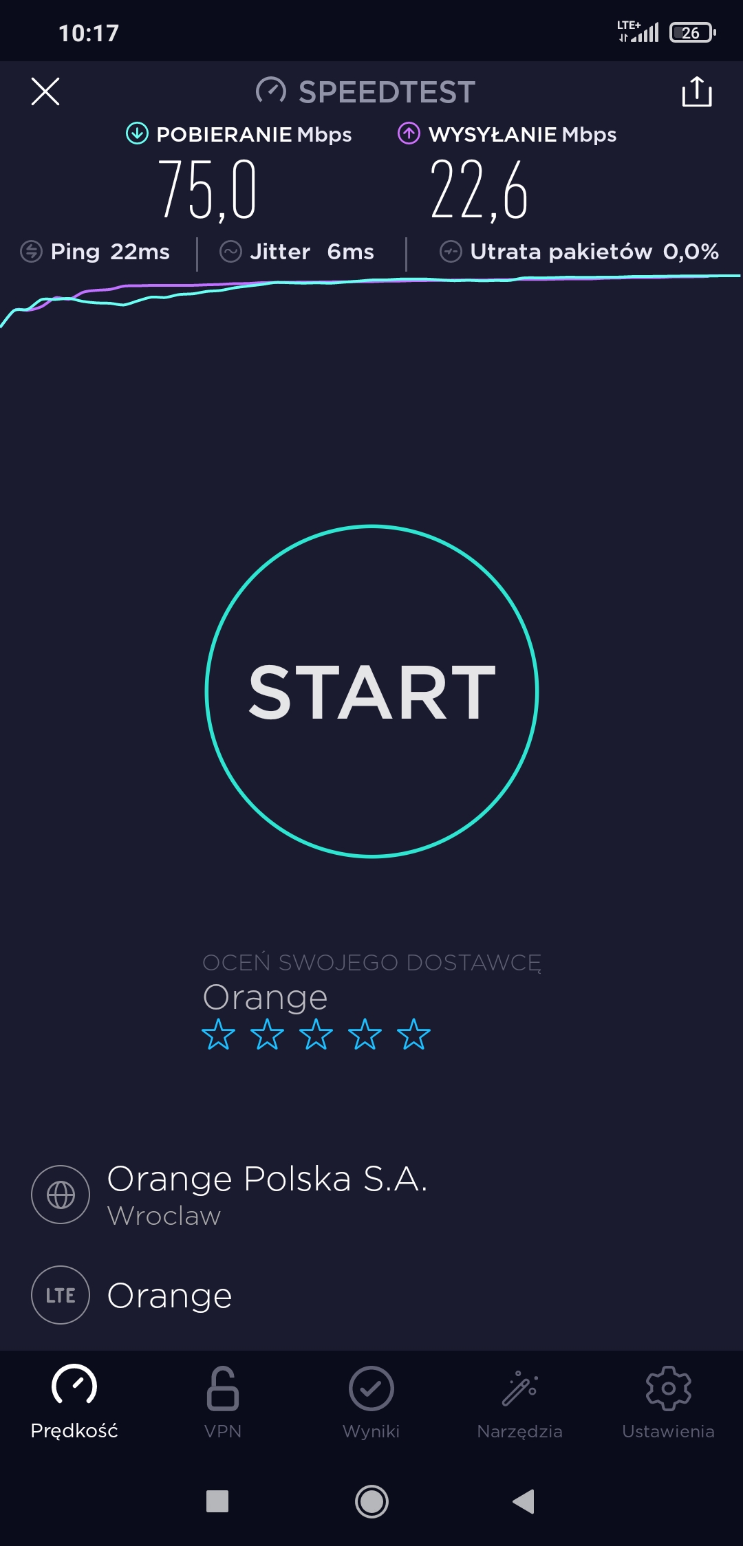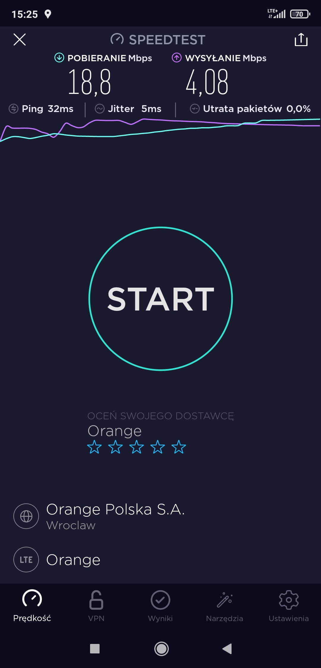 W tych okolicznościach trudno nawet próbować realizować jakikolwiek test transmisji danych. Reasumując, Orange dzieli los T-Mobile, ale jego sieć nie kompromituje się komunikatem o treści „no signal”. Zawsze coś 😉