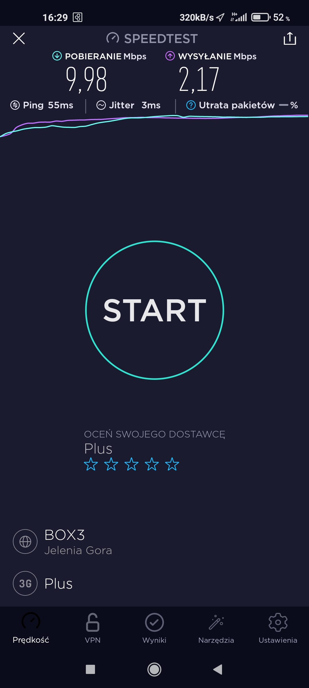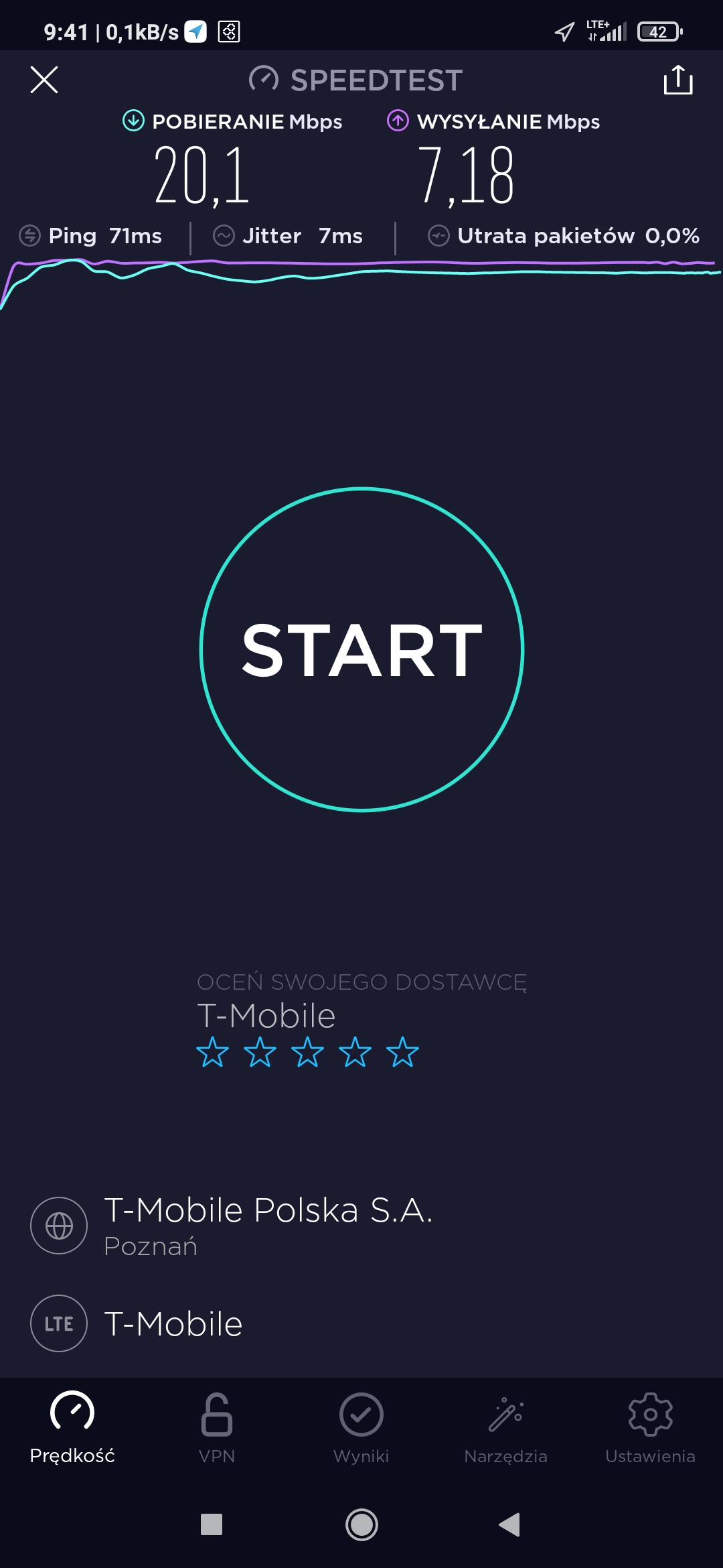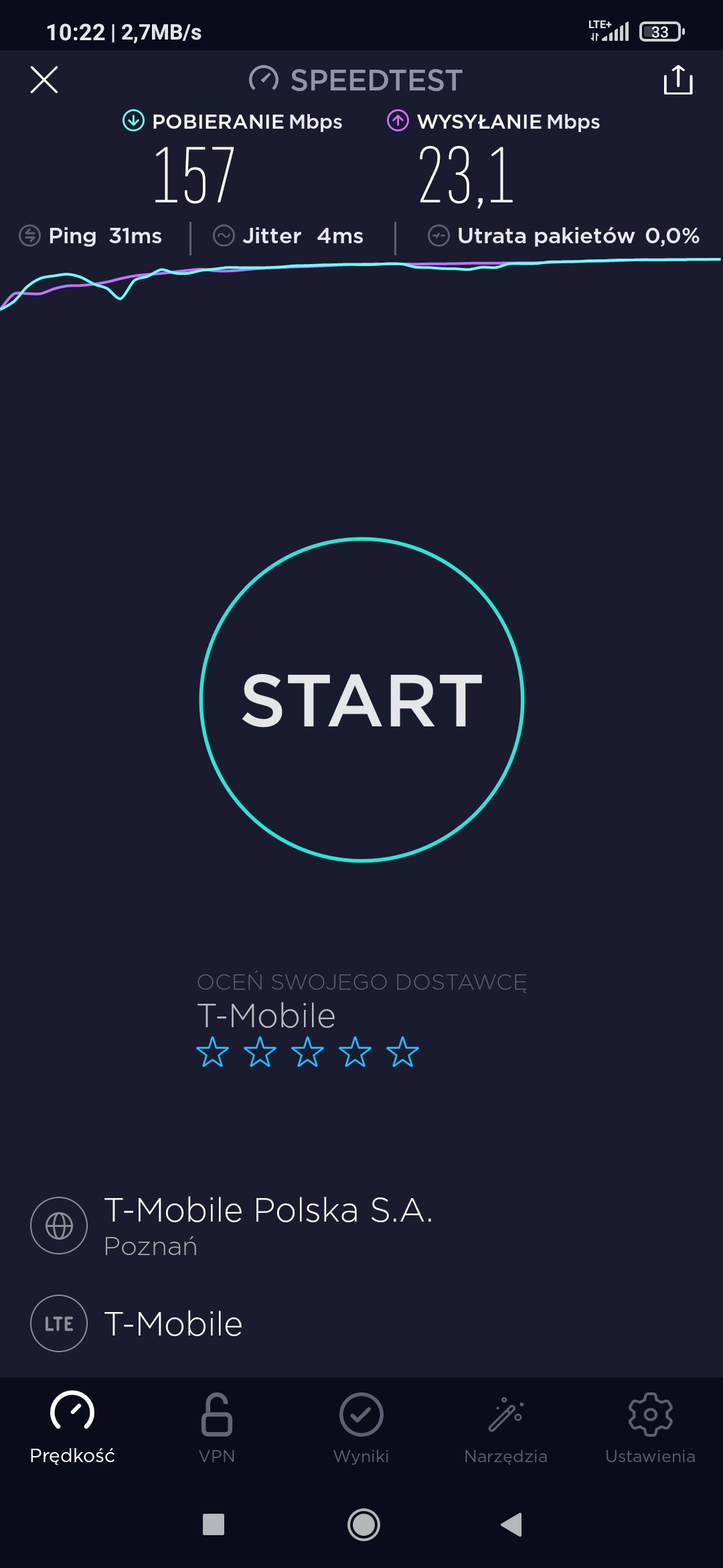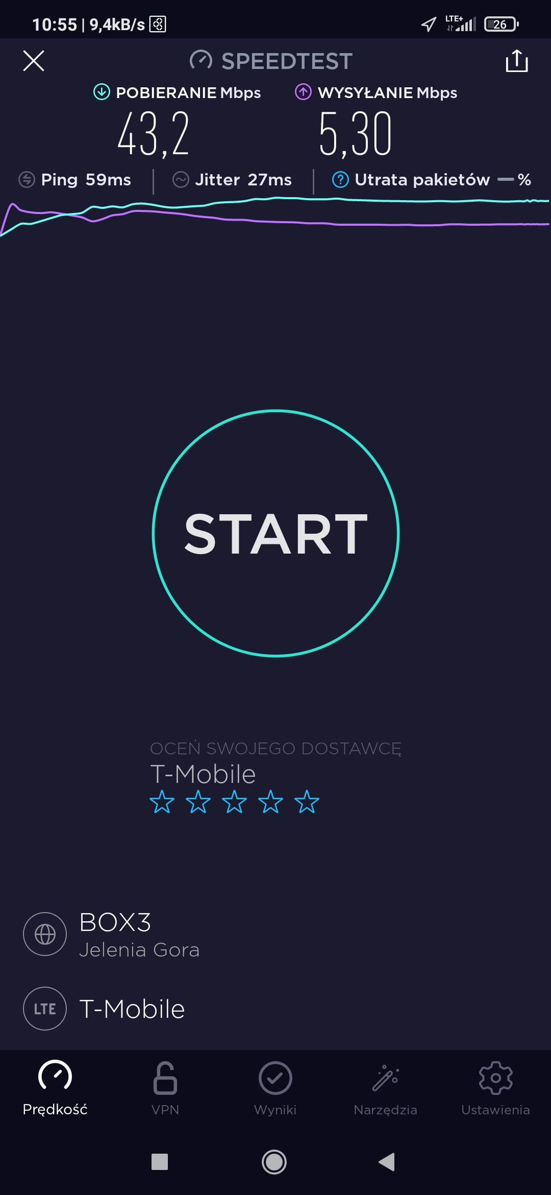 Pomimo zasięgu 3G i tylko 3G w T-Mobile w punkcie testowym próbowaliśmy podjąć testy speedtest. Niestety, przy teście upload transmisja się zawieszała, więc po czwartej próbie odpuściliśmy