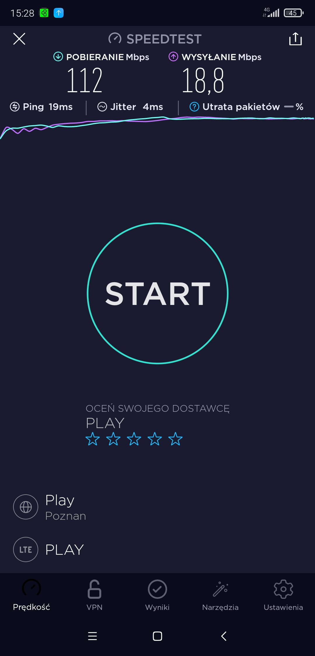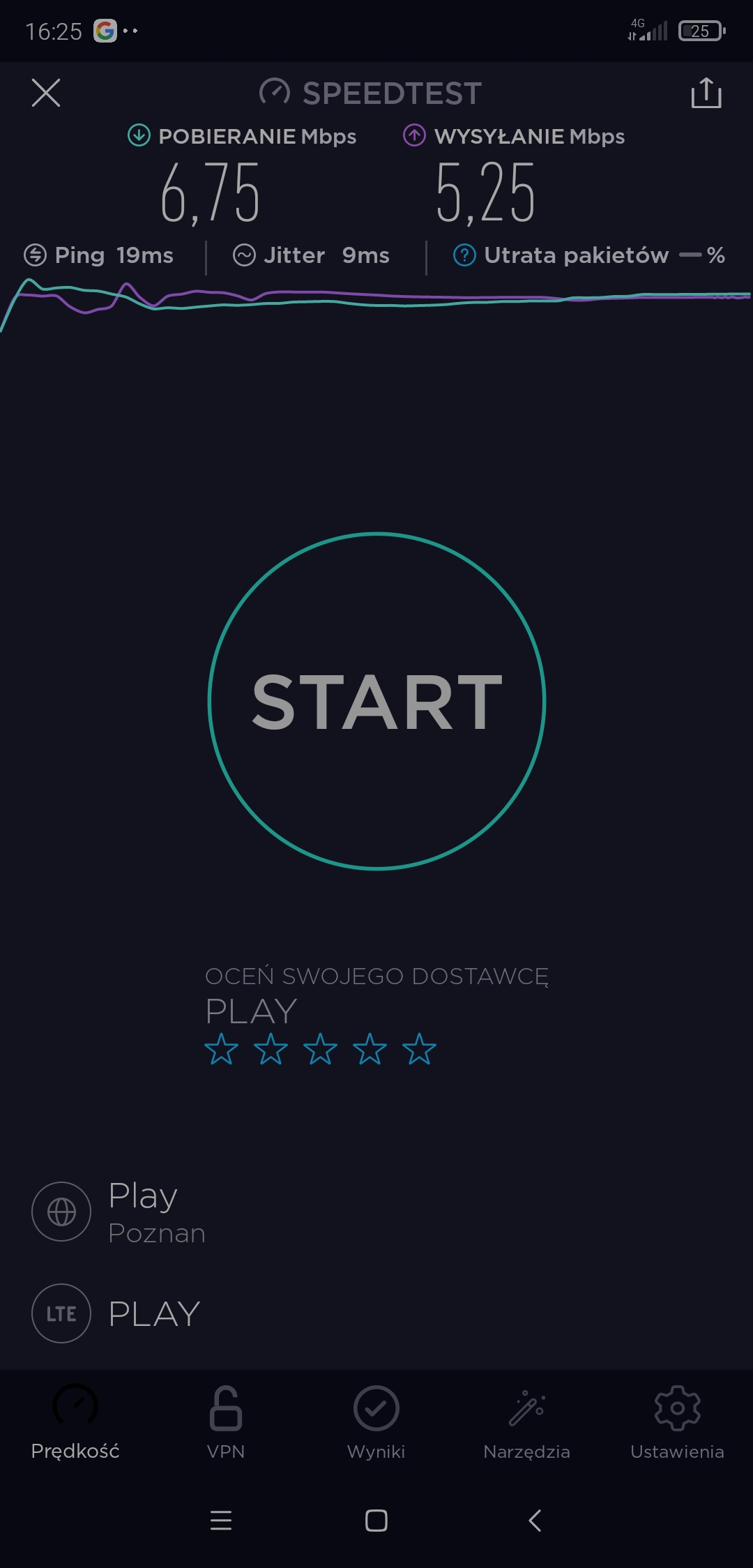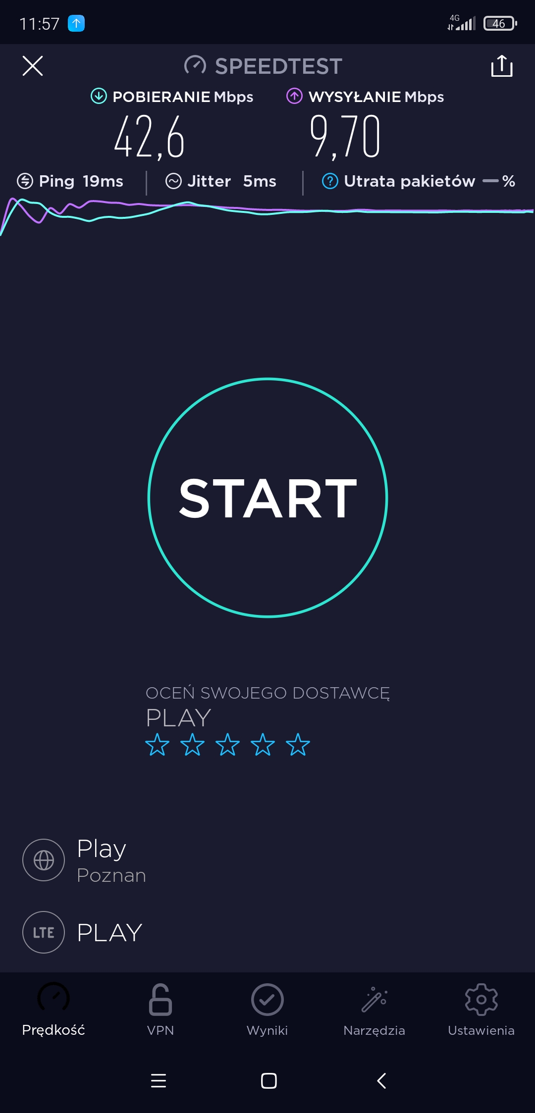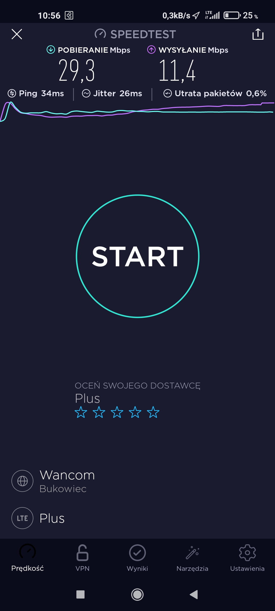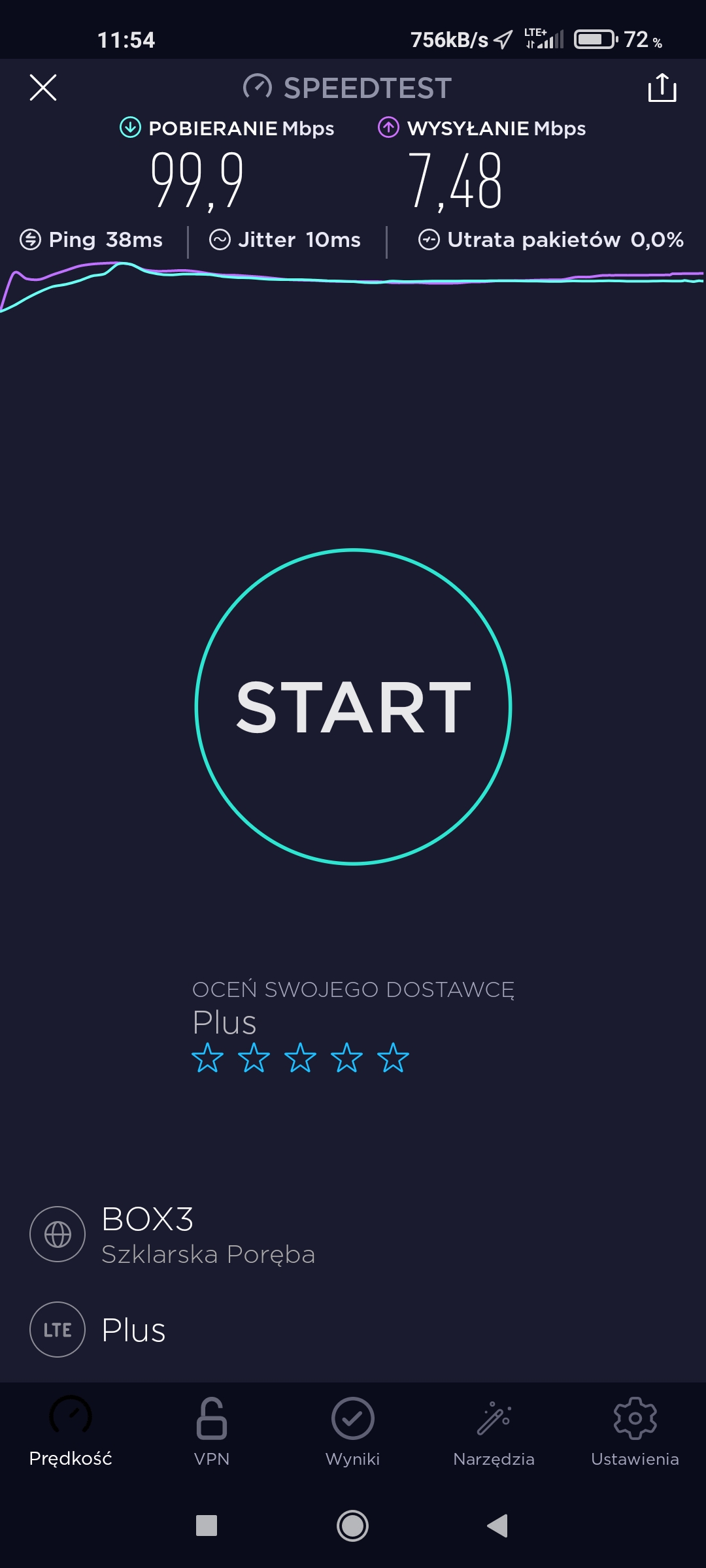 Pomimo zasięgu 3G i tylko 3G w T-Mobile w punkcie testowym próbowaliśmy podjąć testy speedtest. Niestety, przy teście upload transmisja się zawieszała, więc po czwartej próbie odpuściliśmy