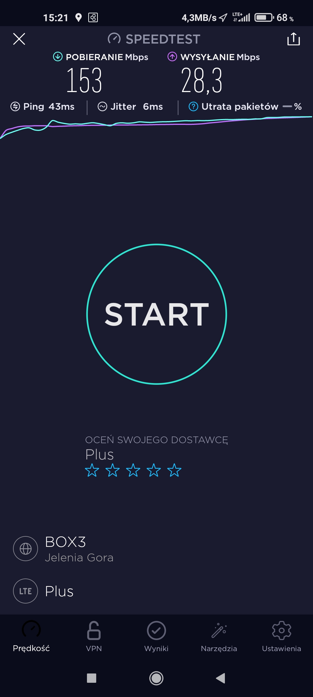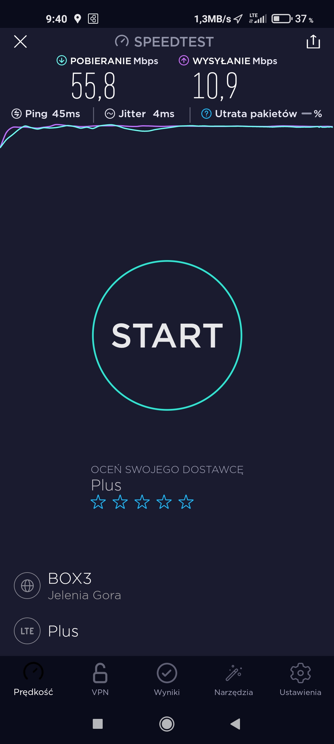 Przy okazji prezentacji jakości transmisji danych na trasie kolejowej wspomnieliśmy, że tam, gdzie Plus potrafi rozsądnie wykorzystać posiadane zasoby radiowe, w tym zoptymalizować ilość sektorów – tam rzeczywiście pokazuje pazur. Podobnie jest w Zgorzelcu, choć nie ukrywajmy – operatorowi brakuje wedle naszych szacunków nie mniej jak trzech nowych stacji. Jednak przy tym stanie, który posiada i przy tym, co oferuje konkurencja, w tym… niespodziewanie ta główna, globalna – Plus ma wyraźną przewagę. Zarówno pokryciową, jak i w jakości transmisji danych. Co ciekawe, byliśmy w Zgorzelcu około półtora roku temu i Plus oferował „coś podobnego”, co dziś ze swoich stacji daje Orange oraz T-Mobile. Okazuje się, że te półtora roku wiele zmieniło. Głównie za sprawą inwestycji w segment LTE, co – w jakiś sposób – przełożyło się również na dostępność sieci jako takiej.