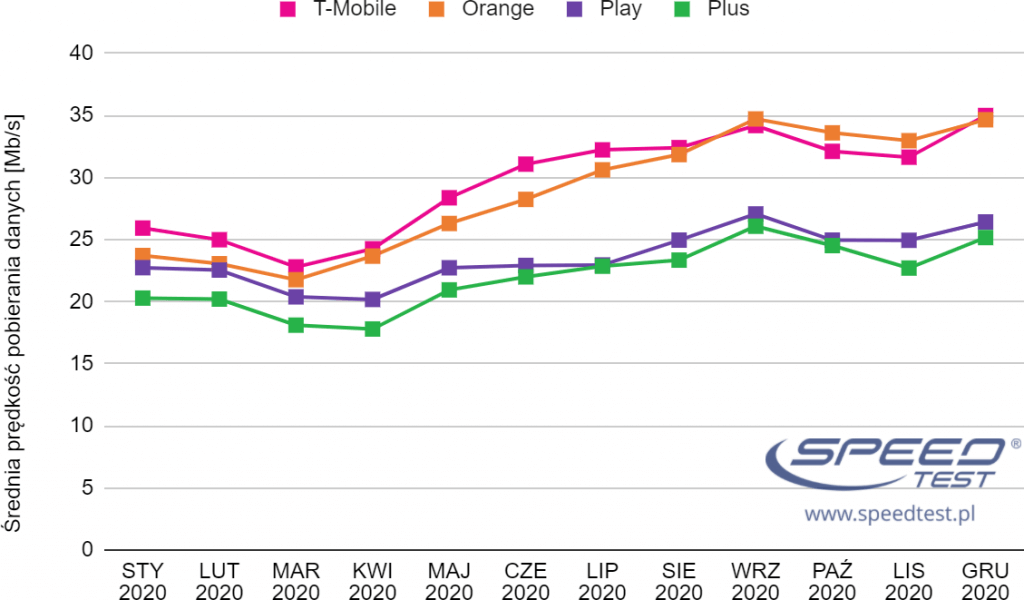 Rok 2020 nie przyniósł zmian w pozycjach poszczególnych operatorów. Koszulkę lidera – dostawcy najszybszego Internetu mobilnego za 2020 rok utrzymał T-Mobile ze średnią prędkością pobierania danych na poziomie 30,5 Mb/s, choć depcze mu po „piętach” Orange z wynikiem 29,6 Mb/s, który przez 3 miesiące wyprzedzał T-Mobile. To zapowiedź interesującej rywalizacji w roku bieżącym.