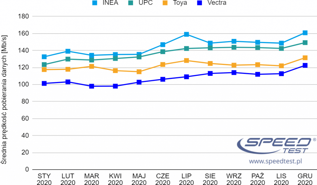 INEA, zwycięzca rankingu ze średnią prędkością pobierania danych na poziomie 144,8 Mb/s wyprzedza UPC, który z wynikiem 137 Mb/s jest jednocześnie najszybszą spośród sieci ogólnopolskich. Podium zamyka łódzka TOYA z downloadem bliskim 122 Mb/s, a tuż za podium plasuje się Vectra z wynikiem prawie 108 Mb/s. Miesięczne statystyki prędkości pobierania danych dla 4 najszybszych operatorów w 2020 roku przedstawia poniższy wykres.