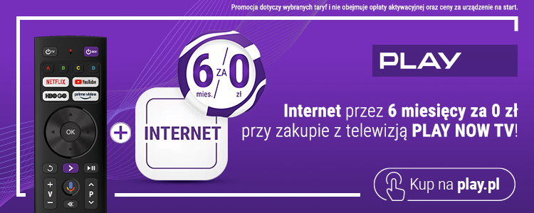 Jeśli zdecyduje się na telewizję PLAY NOW TV w wersji rozszerzonej w cenie 35 zł miesięcznie, za internet nie będzie płacił aż przez pół roku. Klienci chcący skorzystać z usługi internetu bezprzewodowego mogą wybrać jedną z kilku opcji. W ofercie dostępne są pakiety od 100 GB do 500 GB w technologii LTE lub 5G z routerem lub NET BOXEM, który w wielu wypadkach poprawia parametry usługi dzięki umieszczeniu modemu na zewnętrz budynku. Telewizja PLAY NOW TV to nowoczesny produkt, który łączy w sobie dostęp do popularnych kanałów telewizyjnych oraz filmów i seriali na żądanie. Jest oferowana z urządzeniem TV BOX, który wykorzystuje system operacyjny Android TV. Dzięki temu daje dostęp do popularnych aplikacji ze sklepu Google Play, które można dowolnie pobierać na urządzenie. Najpopularniejsze, takie jak Netflix czy YouTube są już na nim zainstalowane. Inne np. Player, Ipla, czy TVP VOD można pobrać w każdej chwili. Zastosowanie funkcji wyszukiwania głosowego umożliwia łatwe odkrywanie treści dostępnych zarówno w PLAY NOW TV, jak również w innych zainstalowanych aplikacjach. W podstawowej wersji usługi w cenie 10 zł miesięcznie (20 zł dla osób niekorzystających z innych usług w Play) dostępnych jest 41 różnorodnych kanałów. Ofertę można w dowolnym momencie rozszerzyć o dodatkowe pakiety: Sport, Kids, Extra, News czy HBO GO, włączając je bezpośrednio na urządzeniu TV BOX. Wybierając ofertę rozszerzoną za 35 zł (45 zł dla osób niebędących klientami Play), otrzymujemy w ofercie 92 kanały – pakiety Sport, Kids, Extra i News są już wliczone w cenę abonamentu.