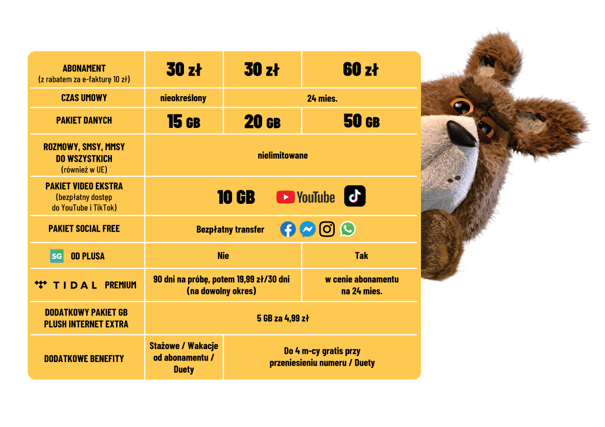 Bez względu na wybrany abonament, wszystkie oferty Plush ABONAMENT zapewniają nielimitowane rozmowy, SMS-y i MMS-y, a dzięki pakietowi Social Free abonenci nie zużywają danych podczas korzystania z popularnych serwisów takich jak Facebook, Messenger, Instagram czy WhatsApp. Wśród benefitów, bez względu na wybrany w umowie pakiet danych, znalazł się również dodatkowy pakiet 10 GB przyznawany co miesiąc do wykorzystania w serwisach YouTube i TikTok. Użytkownicy ofert z pakietem 50 GB otrzymają dostęp do muzycznego serwisu TIDAL bez dodatkowych opłat przez całą umowę. W przypadku pozostałych pakietów klienci mogą korzystać z tego serwisu muzycznego przez 90 dni za darmo, a później w ramach miesięcznej opłaty 19,99 zł.  Wśród dodatkowych usług dostępnych z umową na czas nieoznaczony na uwagę zasługuje możliwość skorzystania z wakacji od abonamentu. Wystarczy wysłać SMS-a na nr 80666 w treści wpisując „wakacje”, by od najbliższego okresu rozliczeniowego nie płacić za abonament.