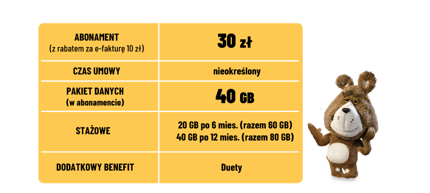 Dla osób, które nie lubią sztywnych zobowiązań przygotowany został abonament z umową na czas nieokreślony z pakietem 15 GB w cenie 30 zł/mies. W tym wariancie klient otrzymuje również dodatkowy pakiet danych za staż. Po 6 miesiącach pakiet internetowy zwiększa się do 20 GB do wykorzystania co miesiąc, a po 12 miesiącach do 25 GB miesięcznie. Wszystko w myśl zasady: „im dłużej zostajesz, tym więcej gigabajtów w pakiecie internetowym dostajesz”.
