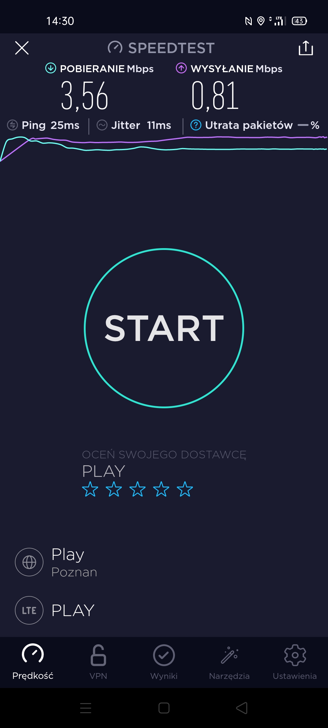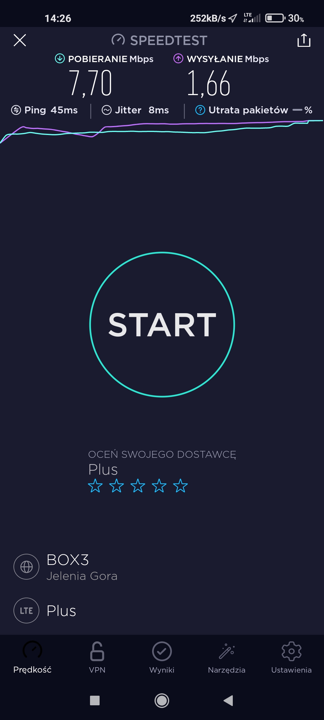 Dotarliśmy do uroczego miejsca – Wodospadu „Kropelka” w Piechowicach-Górzyńcu na Pogórzu Izerskim. Plus oraz Play udostępniają klientom przy samym wodospadzie dostęp do segmentu LTE, natomiast operatorzy z grupy Networks! – UMTS. Jako przedstawiciela w grupie Networks! wybraliśmy zrzut ekranu dla Orange. Jakość sygnału w sieci T-Mobile wyglądała analogicznie. Testy speedtest zrealizowaliśmy dla podmiotów, oferujących dostęp do LTE