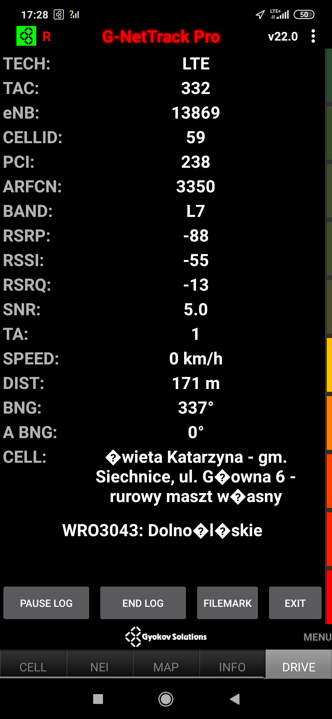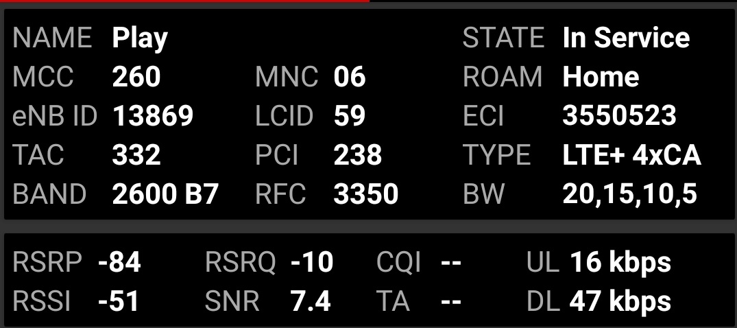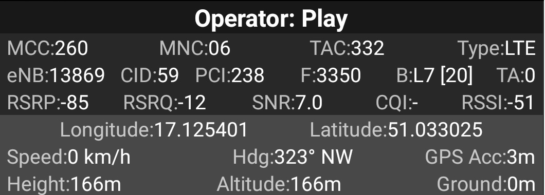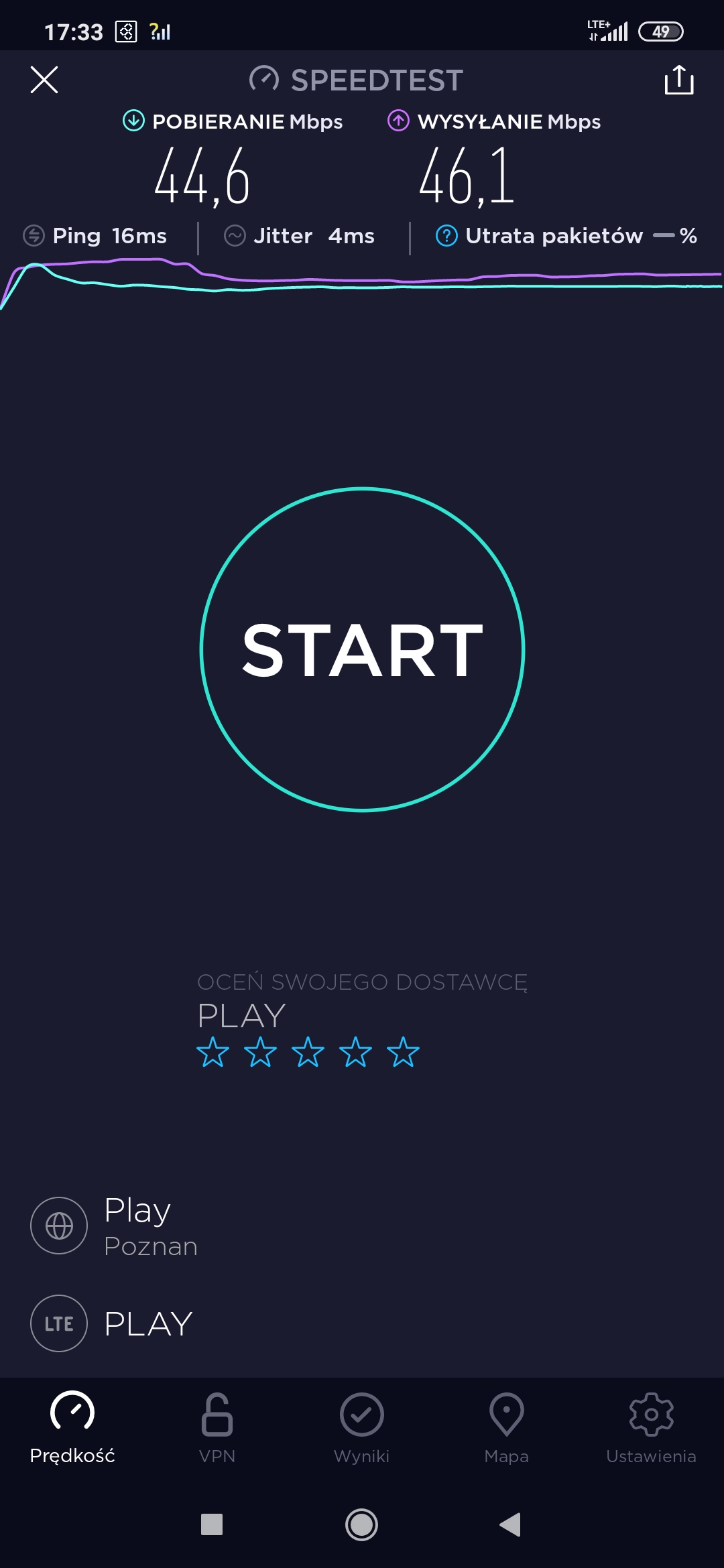 Jakość sygnału i wynik pomiaru speedtest pod stacją:
