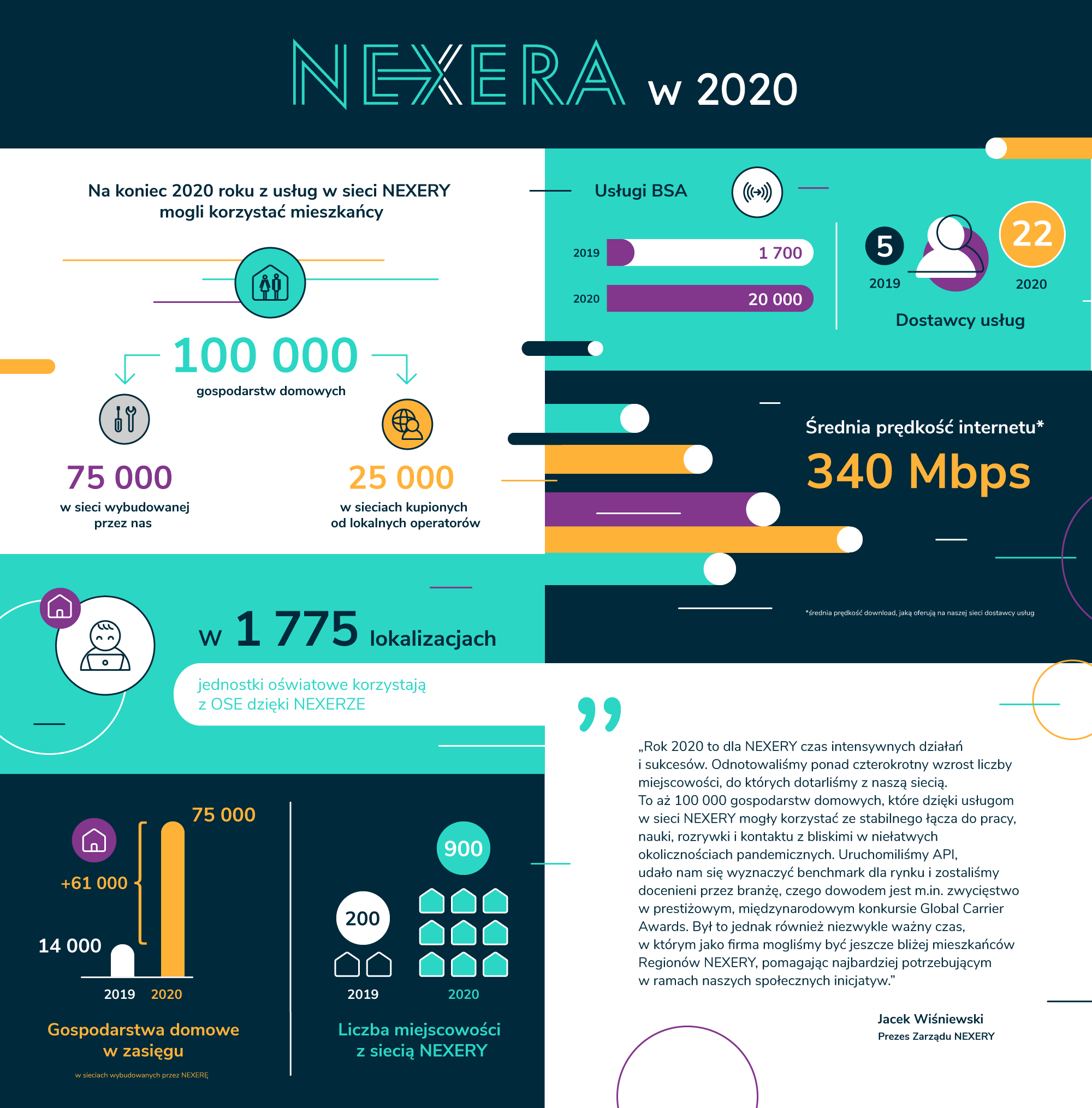 Coraz większa liczba mieszkańców Regionów NEXERY może korzystać z dostępu do bardzo szybkiego internetu, wybierając z nawet dziesięciu ofert operatorów detalicznych oferujących swoje usługi w jednym adresie. Zasięg sieci budowanej przez Nexerę od podstaw objął 75 tys. gospodarstw domowych – to ponad 5-cio krotny wzrost w stosunku do stanu z końca 2019 roku. Zasięg ten to wynik projektów prowadzonych w ramach POPC i ich rozszerzeń komercyjnych. Dzięki zakupom sieci światłowodowych od operatorów lokalnych, Nexera powiększyła zasięg swojego działania o kolejne 25 tys. gospodarstw domowych. Sieci te, zapewniając usługę abonentom przez dotychczasowych dostawców, podlegają obecnie integracji technicznej i systemowej. Z wyboru ofert wielu operatorów detalicznych mieszkańcy będący w ich zasięgu będą mogli korzystać w 2021 roku. Rok 2020 Nexera zakończyła, dając możliwość korzystania z usług na swojej sieci światłowodowej mieszkańcom 900 miejscowości w czterech Regionach NEXERY: Warmii i Mazur, Kujaw z Pomorzem i Mazowszem, Łódzkim i Świętokrzyskim. Obecność światłowodowej infrastruktury Nexery w ciągu jednego roku zwiększyła się z 200 do ponad 900 wsi i miast Polski. Nexera zapewniła również na koniec 2020 roku łącza do 1 775 szkół, dzięki którym mogły one korzystać z Ogólnopolskiej Sieci Edukacyjnej.
