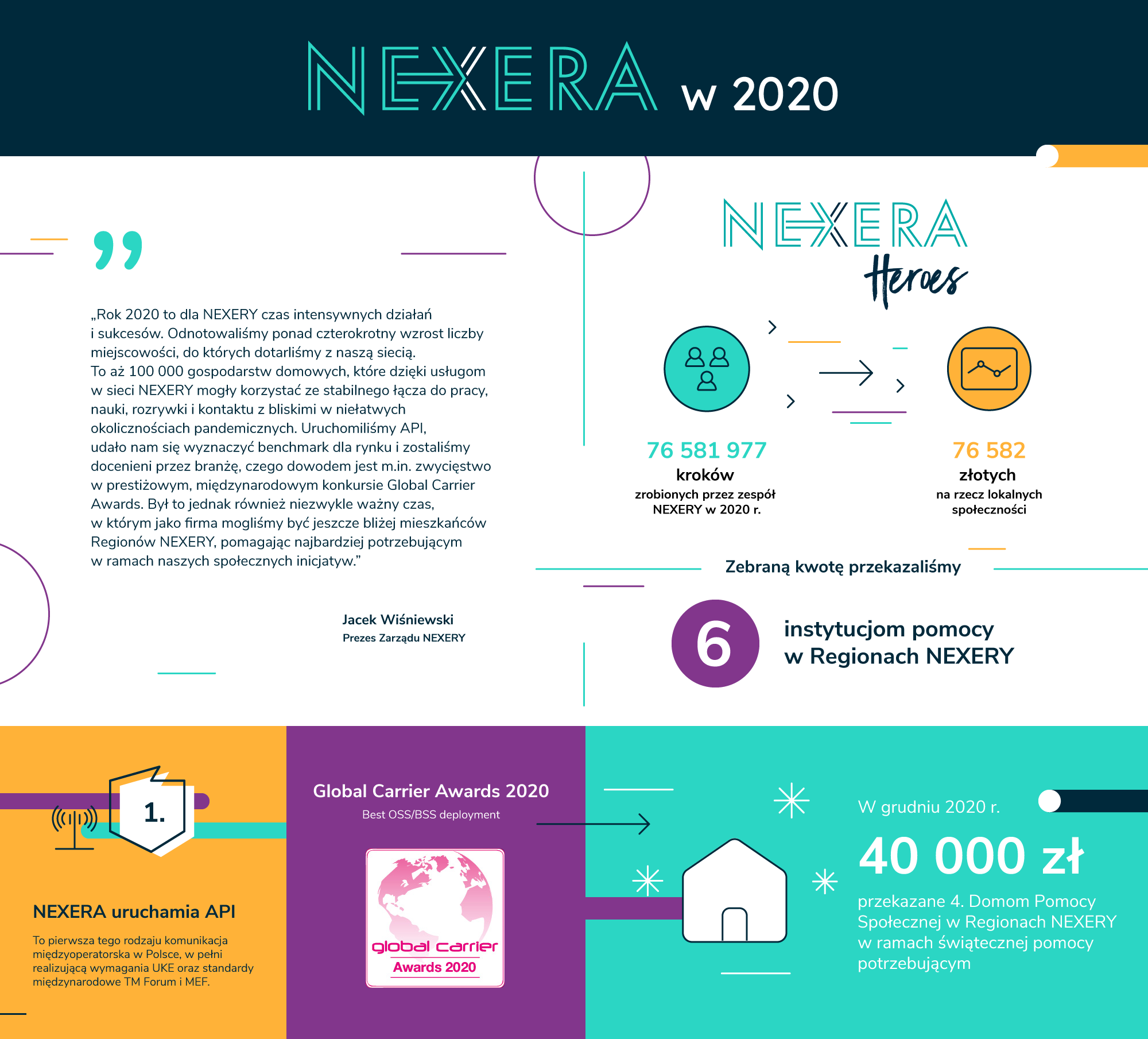 W 2018 r. zespół Nexery zainicjował stworzenie autorskiego programu #NexeraHeroes, który powstał z chęci niesienia pomocy innym. Tylko w 2020 r. Nexera przekazała ponad 76 tys. złotych na rzecz lokalnych społeczności. Ze wsparcia skorzystało 6 instytucji w Regionach Nexery, w tym m.in Specjalny Ośrodek Szkolno-Wychowawczy w Lidzbarku Warmińskim. W maju 2020 r. firma przekazała 40 tys. zł czterem Domom Pomocy Społecznej na pomoc w walce z COVID-19, a kolejne cztery DPS-y świąteczne dofinansowanie w wysokości 40 tys. zł otrzymały w grudniu 2020 r. W 2020 r. Nexera wygrała w międzynarodowym konkursie Global Carrier Awards 2020 w kategorii OSS/BSS, dołączając tym samym do grona najbardziej cenionych firm telekomunikacyjnych na świecie, uznanych za te, które z pasją zmieniają branżę telekomunikacyjną.