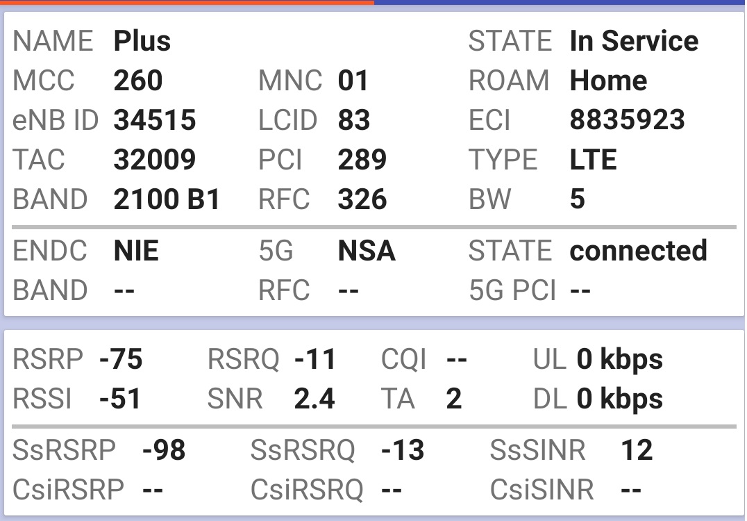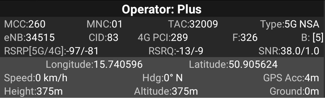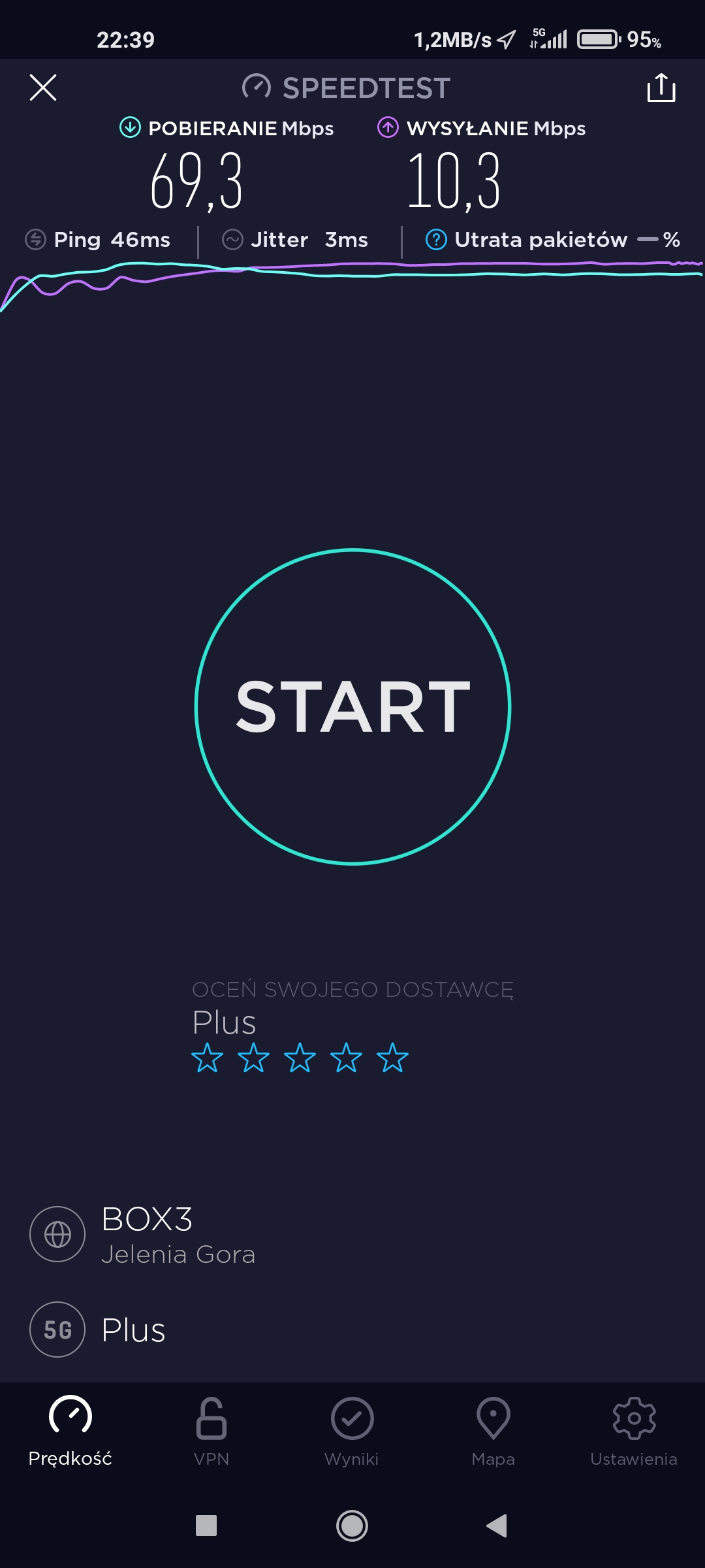 Prezentujemy jakość transmisji danych w sieci 5G dla jeleniogórskiej stacji Plusa o kodowym numerze: BT-34515, pracującej w śródmieściu. Test zrealizowano w dniu wczorajszym na zewnątrz. Terminal: Xiaomi MI 10T Pro. Godzina testu, to 22:39. Stacja została doposażona w ostatnim czasie w 5G, rozszerzono ją również o LTE2100 oraz czwarty sektor. Dodajmy, że wartości transmisji w LTE są na podobnym, jakościowym poziomie