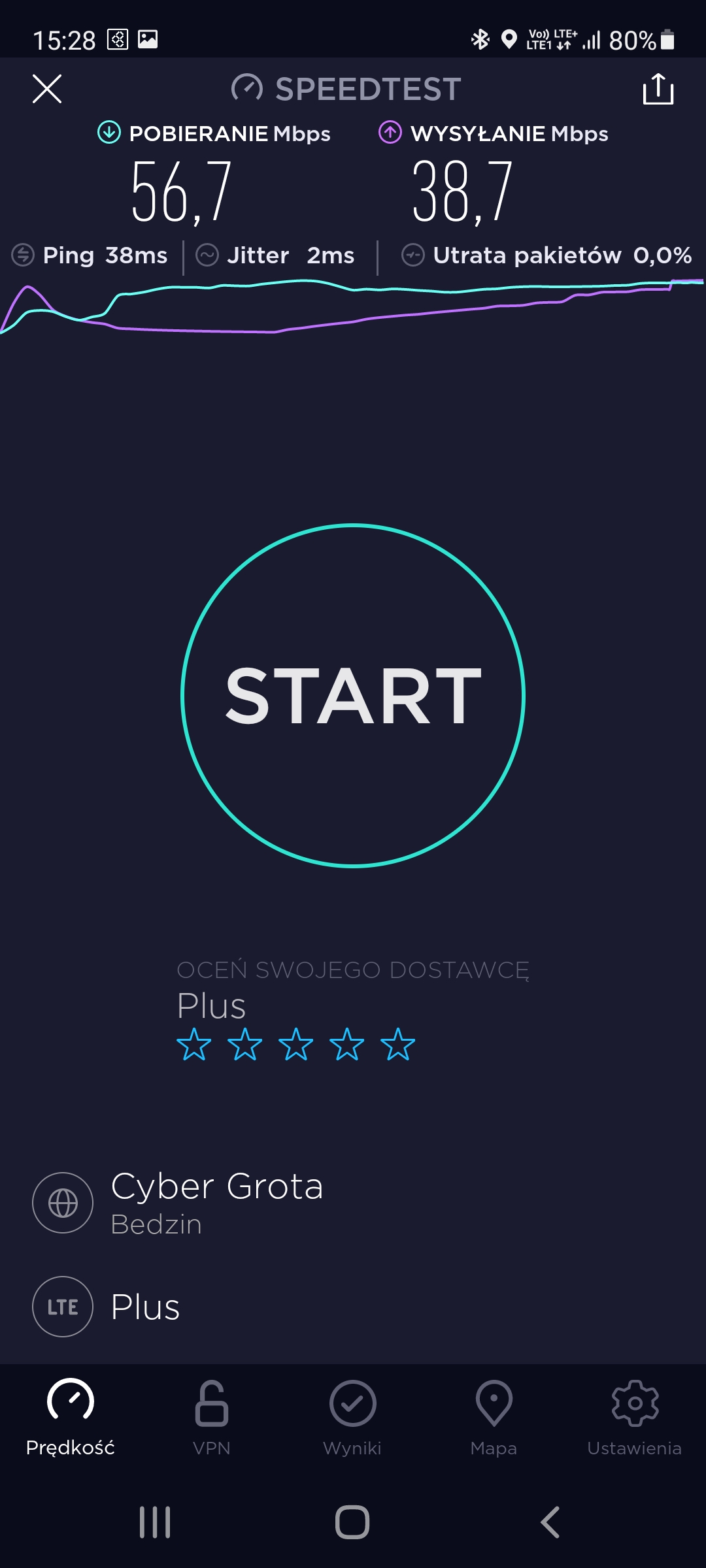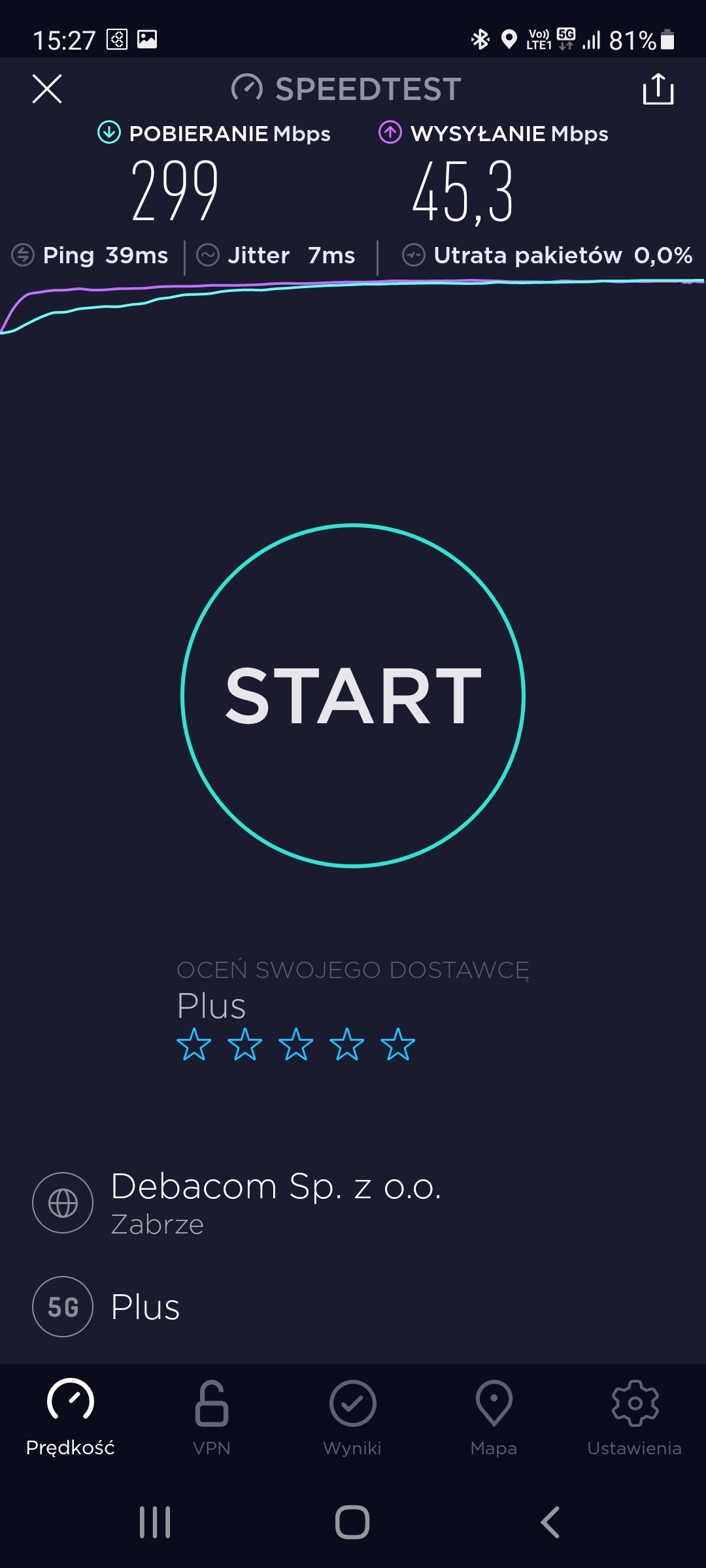 Zrzuty ekranów z aplikacji mobilnej speedtest.net w pasmach: LTE oraz 5G poniżej.