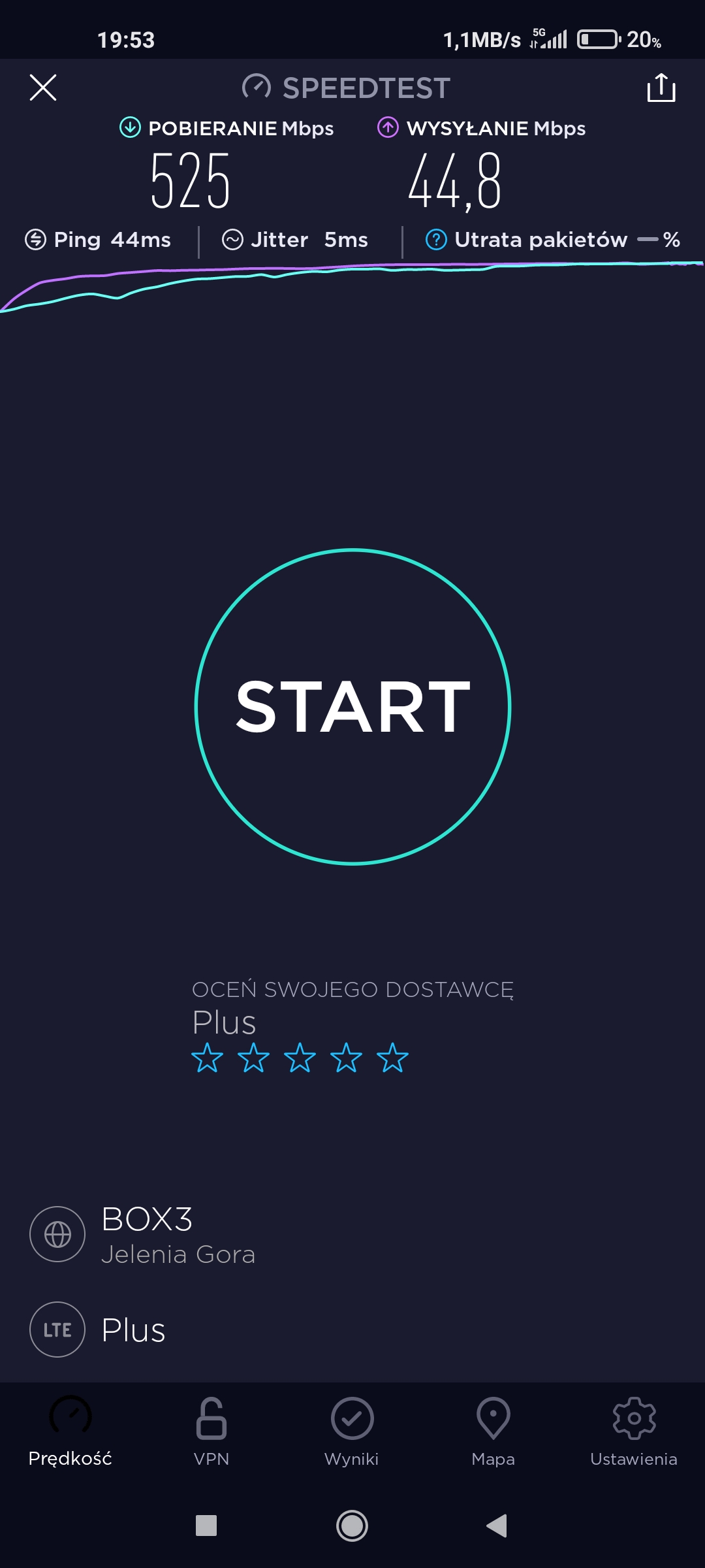 525 Mbps? Łał, jednak można. 😀 Pozostałe sektory w 5G też świetnie. Chyba pierwsza stacja w Jeleniej Górze z takimi wysokimi prędkościami.