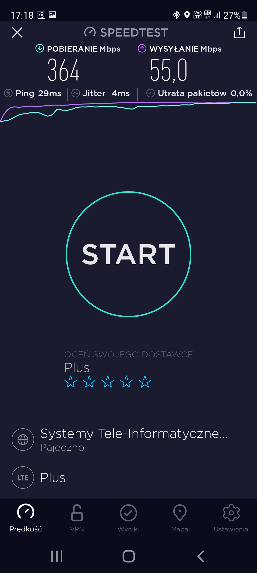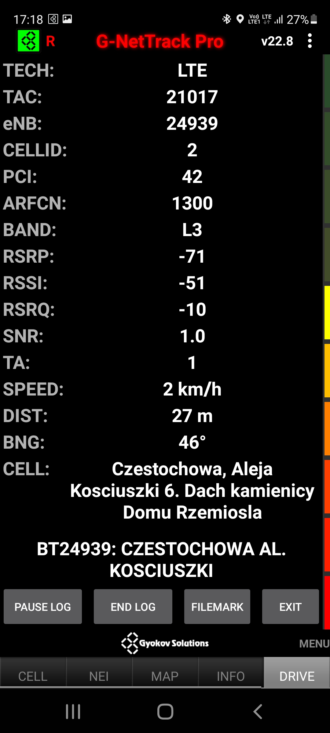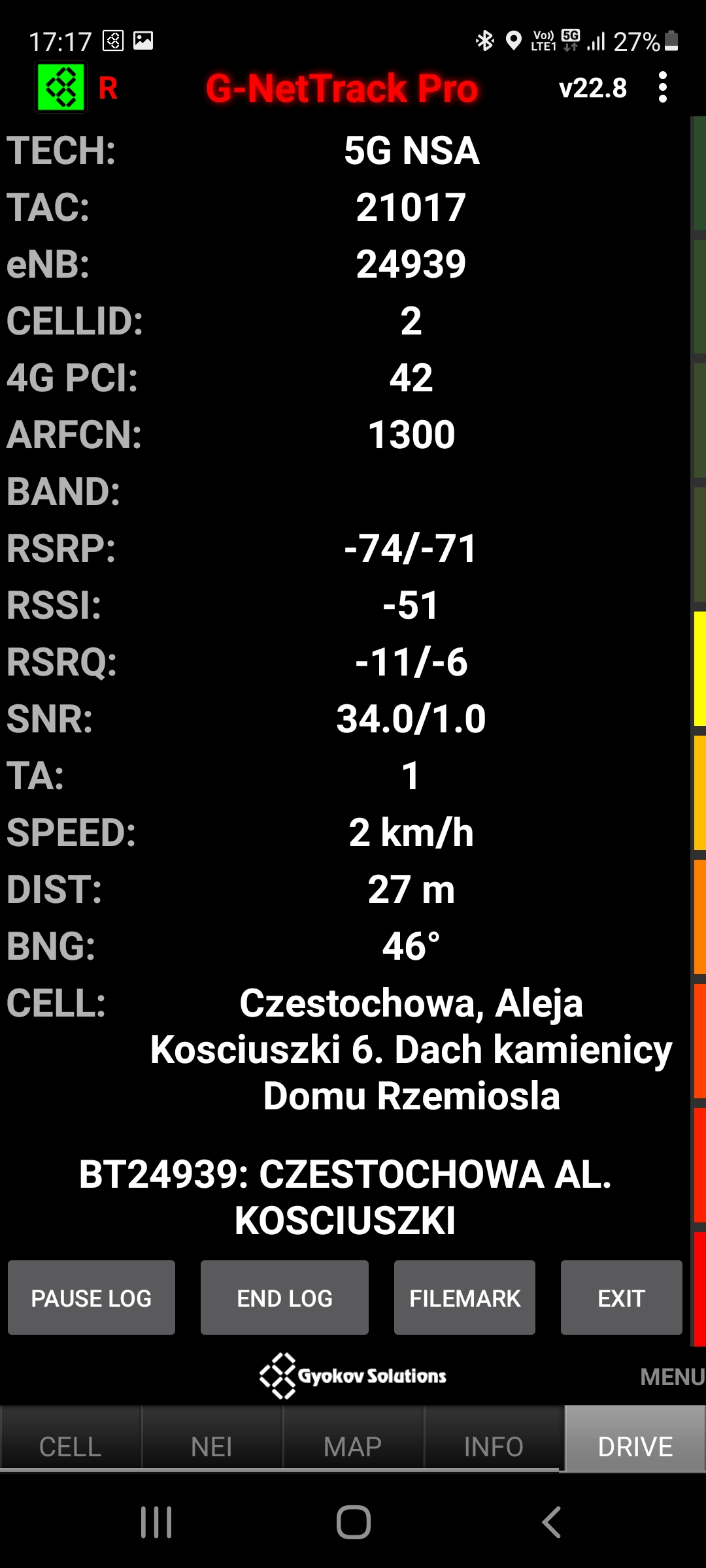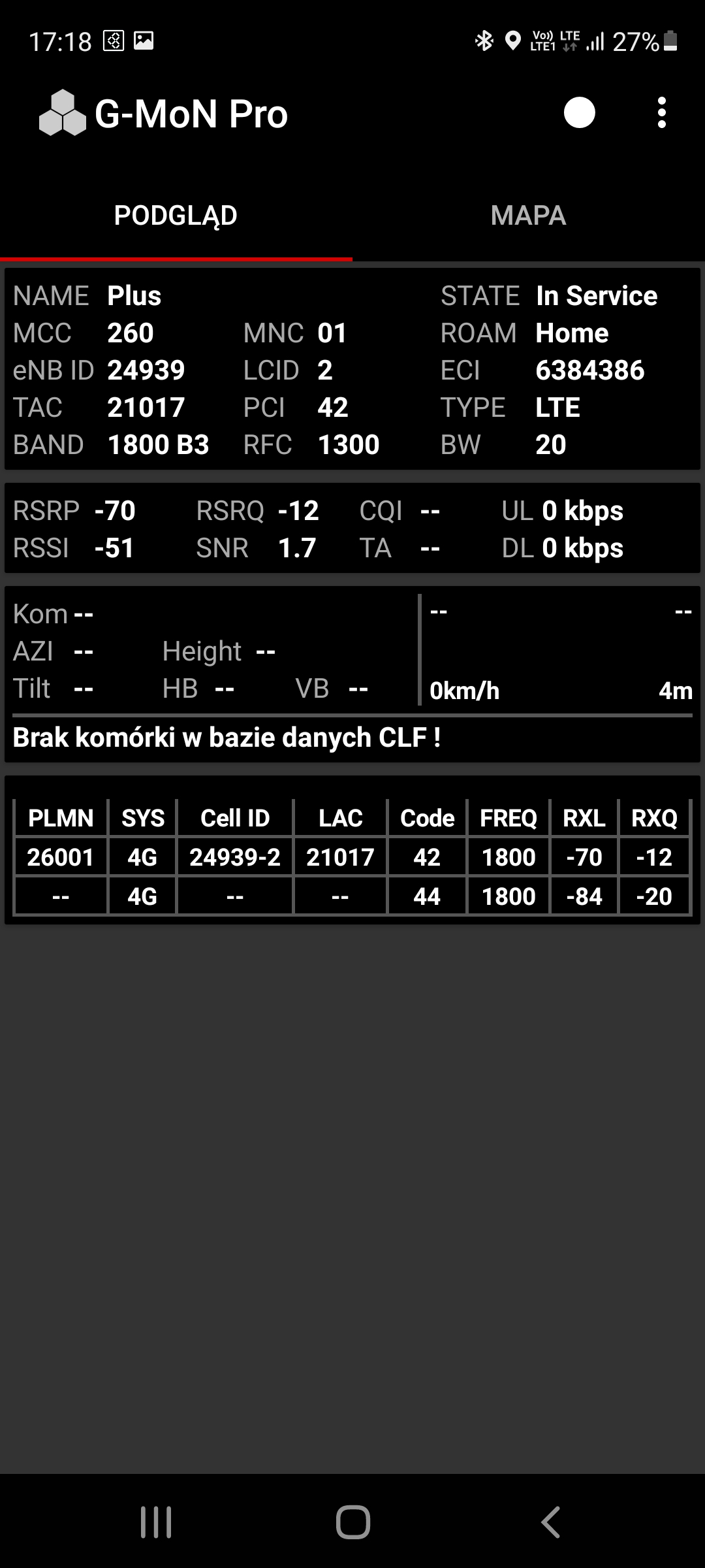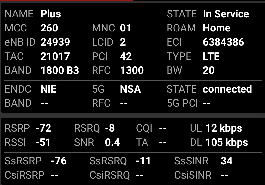 Prezentujemy jakość transmisji danych dla stacji Plusa o kodowej nazwie BT-24939 Częstochowa Kościuszki. Poniżej dane dla segmentu LTE oraz 5G.