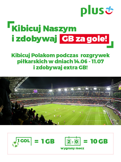 Kibicujemy Polakom na piłkarskim EURO 2020 i rozdajemy „Gigsy za gole”! Od piątku dwadzieścia cztery drużyny rywalizują o tytuł najlepszej piłkarskiej reprezentacji Starego Kontynentu, a my trzymamy kciuki za Biało-Czerwonych i rozdajemy dodatkowe gigabajty za strzelone przez nich bramki i wygrane mecze. Startuje nowa promocja, w której klienci wszystkich rodzajów usług telekomunikacyjnych w Plusie i Plushu mogą otrzymać dodatkowe darmowe gigabajty w ramach trwających Mistrzostw Europy w piłce nożnej.