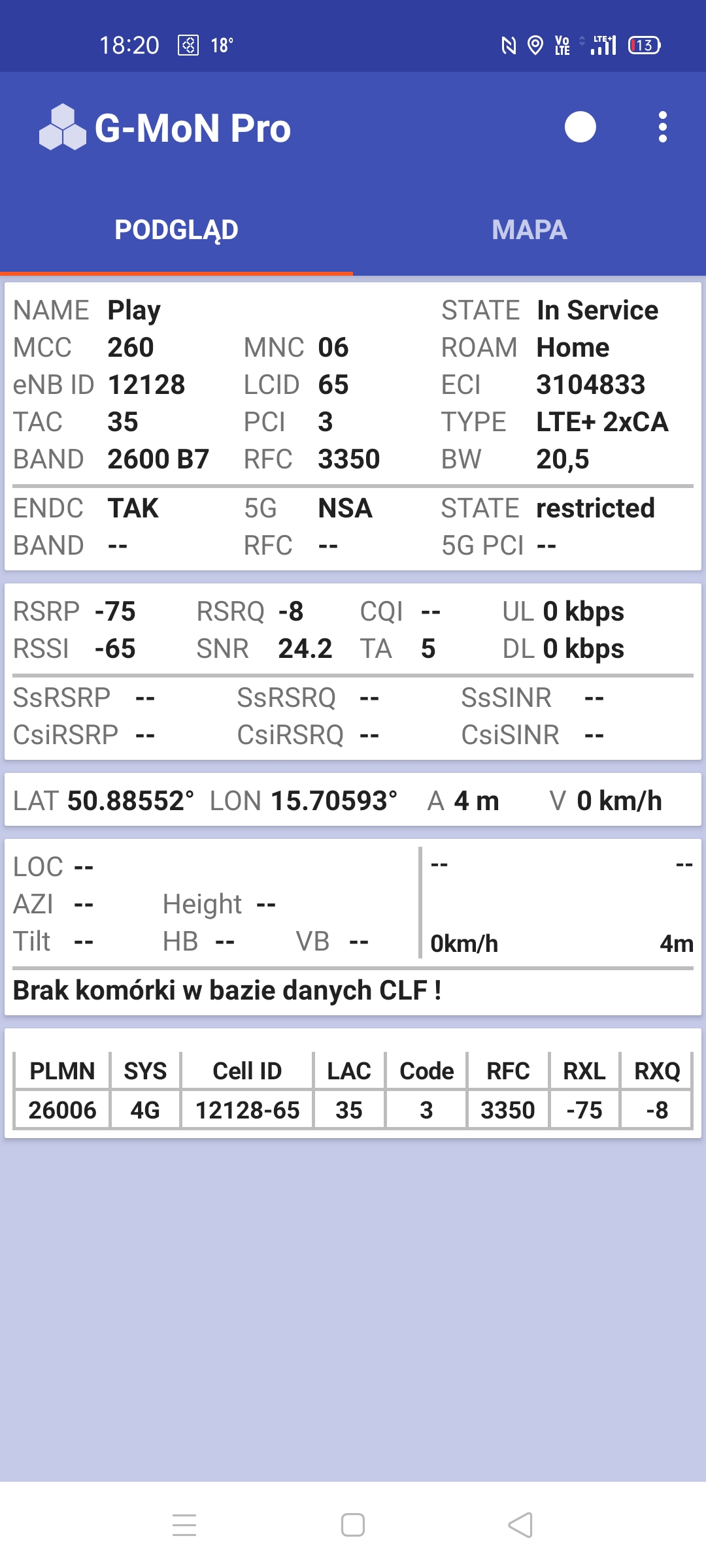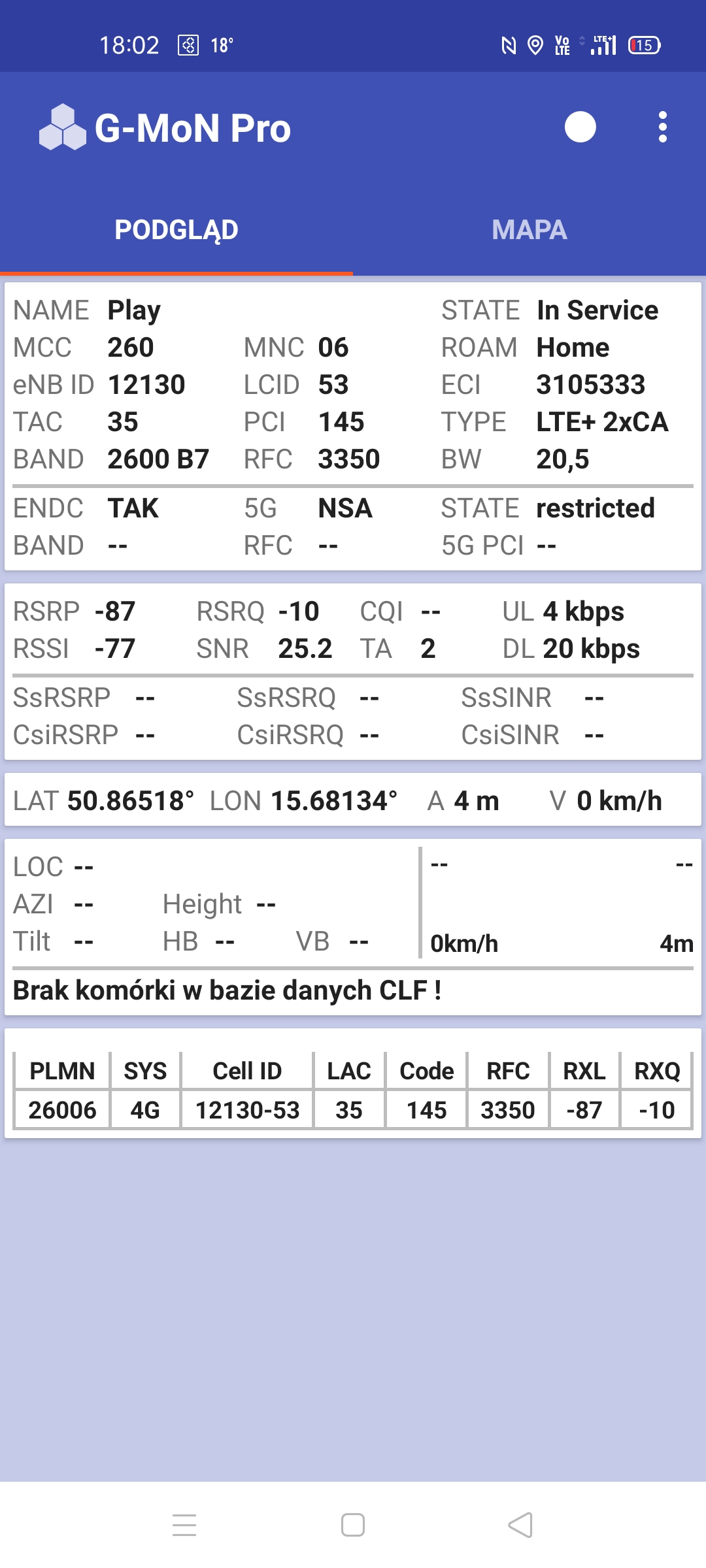 Podobnie, jak w przypadku stacji poprzednich – również i tu stacje wyposażone są w cztery pasma LTE. 5G pracuje również w stacji Play w Szklarskiej Porębie przy ul. Górnej. Do informacji o 5G Play w Jeleniej Górze dokładamy również nadesłaną przez naszego Czytelnika o uruchomieniu 5G operatora w Ełku.
