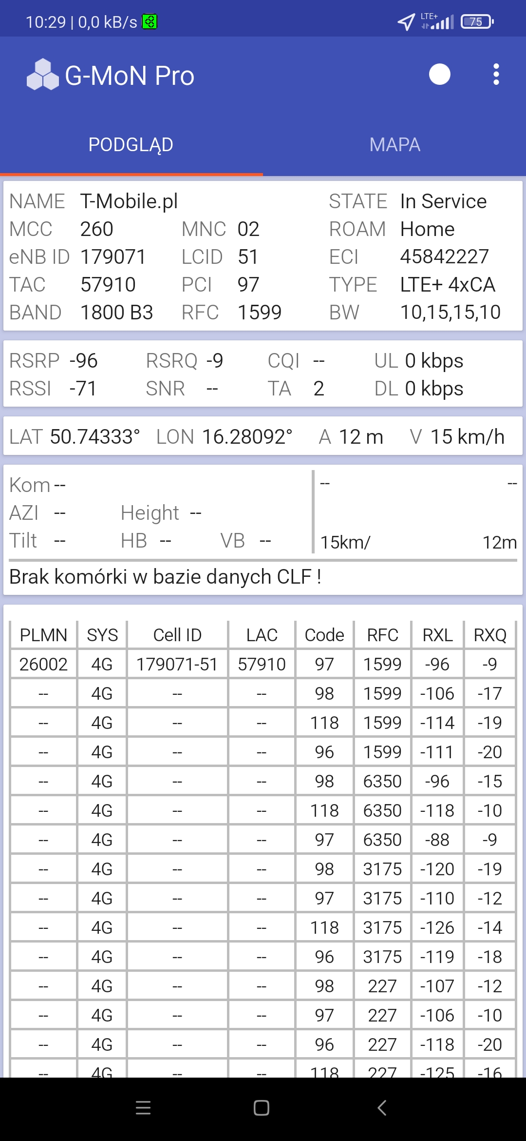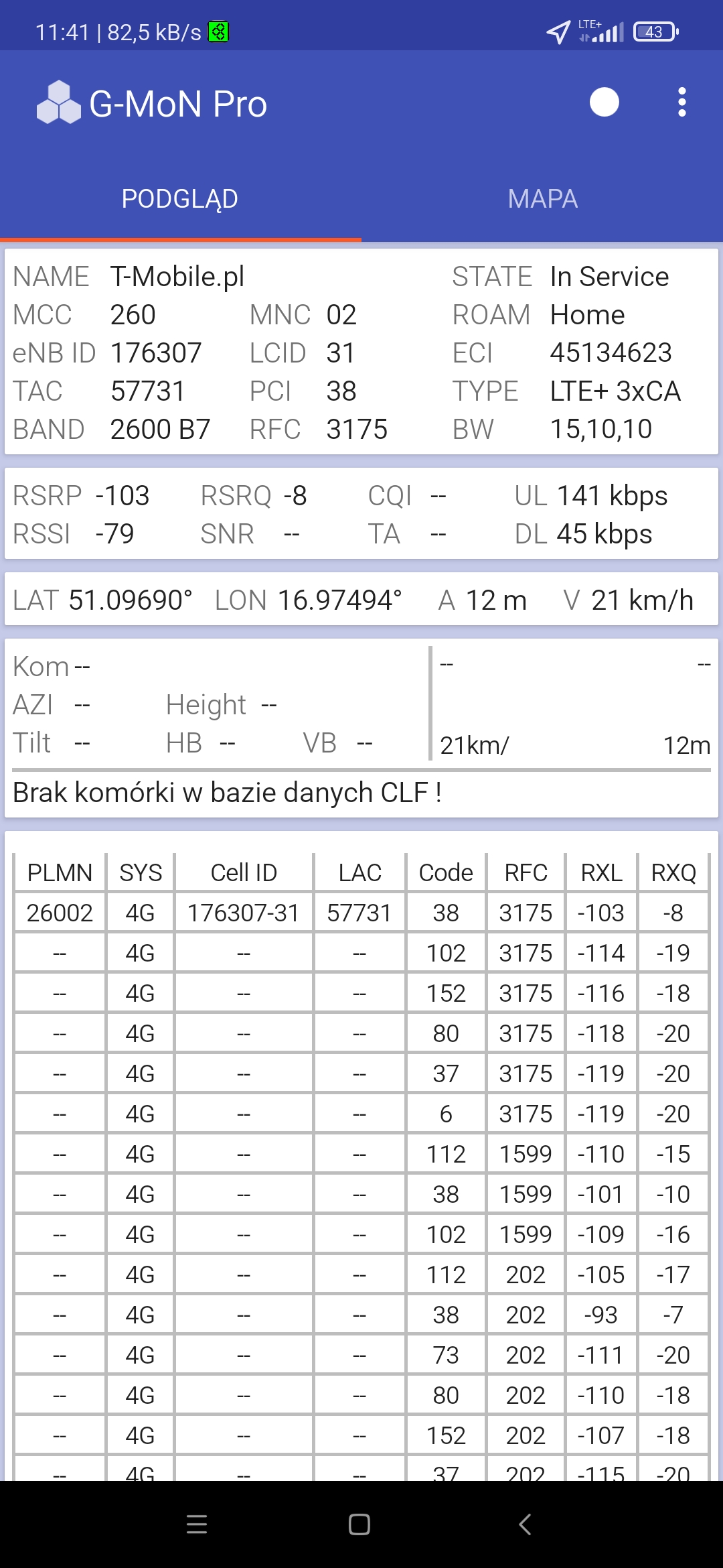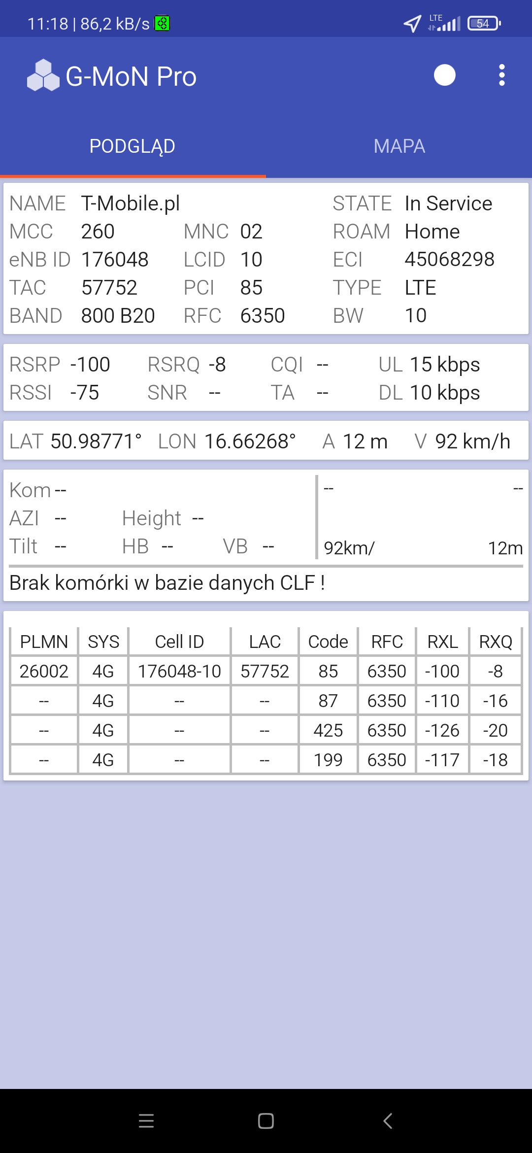 24. Smolec – stacja kolejowa, to możliwość korzystania wyłącznie z segmentu 3G. Zaraz za stacją kolejową uzyskaliśmy dostęp do sieci LTE. Reasumując – trzeba się przyjrzeć stacji, obsługującej przystanek kolejowy. Być może wskazana jest reparametryzacja, być może kolejny sektor?
