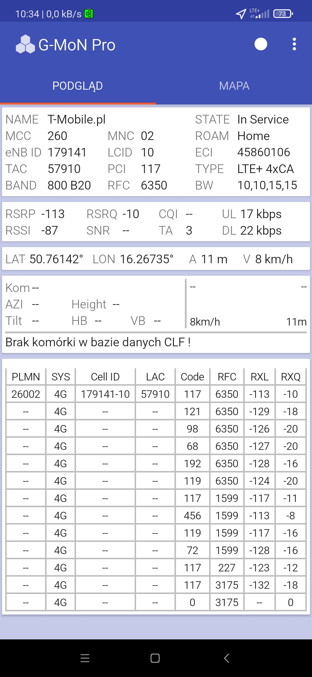 18. Jaworzyna Śląska. Terminal miał poważne problemy z migracją z sieci 3G do LTE, które było serwowane przed dojazdem do stacji mimo tego, że w tym czasie nie trwała transmisja danych.