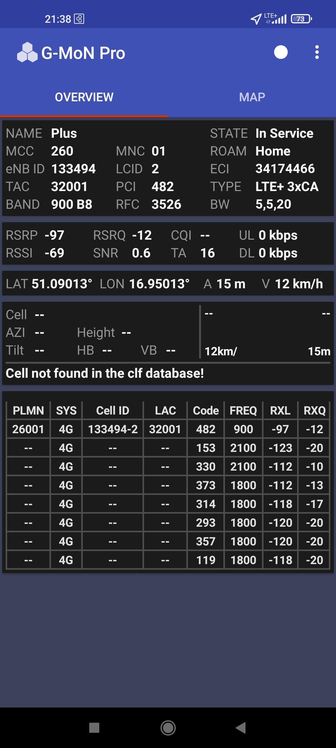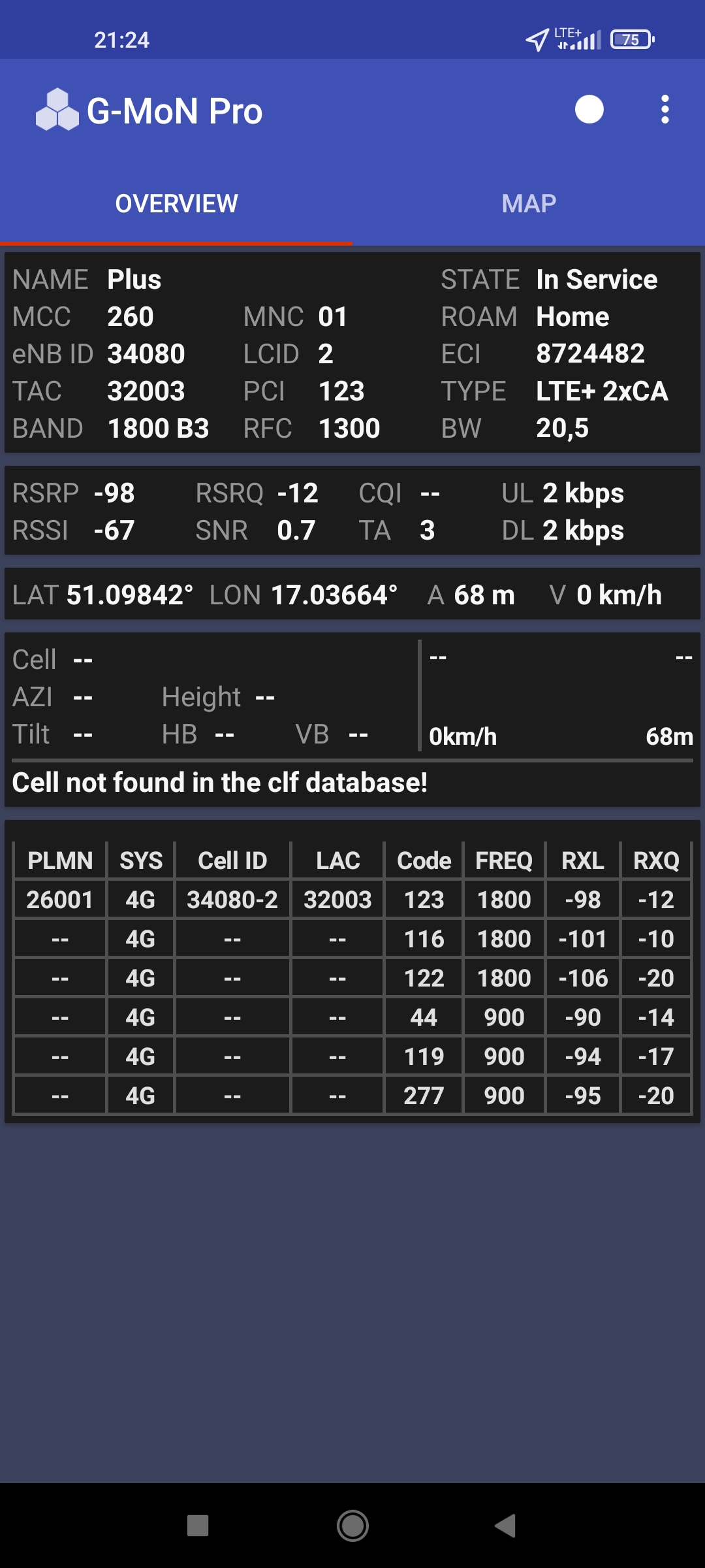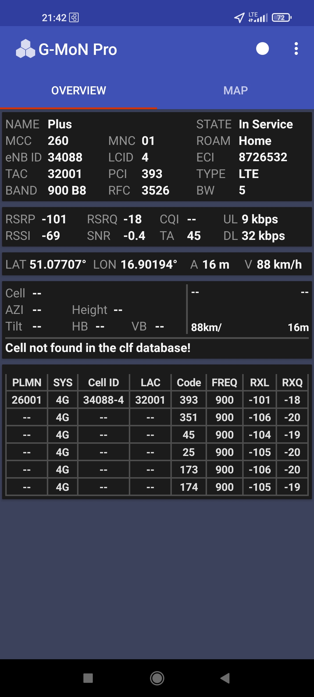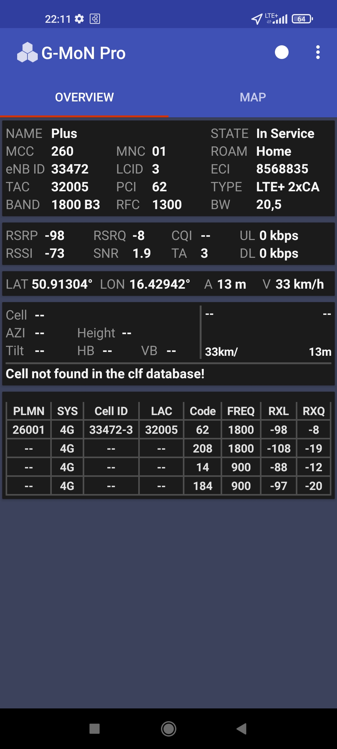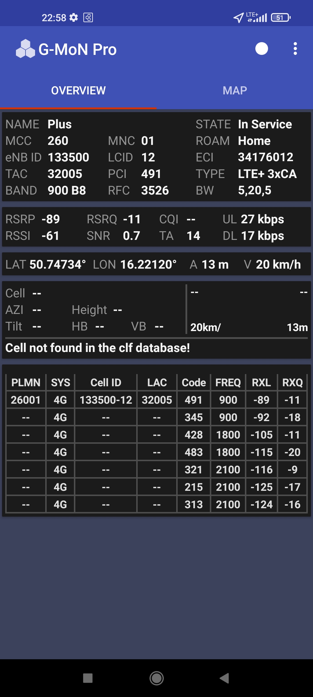 2. Wrocław Grabiszyn – mimo dostępnego sygnału i stacji bazowej z agregacją trzech nośnych transmisja danych stała. Prawdopodobny powód – przeciążona sieć, przeciążona stacja z powodu przejmowania na siebie ruchu ze stacji gorzej radiowo wyposażonych w sąsiedztwie