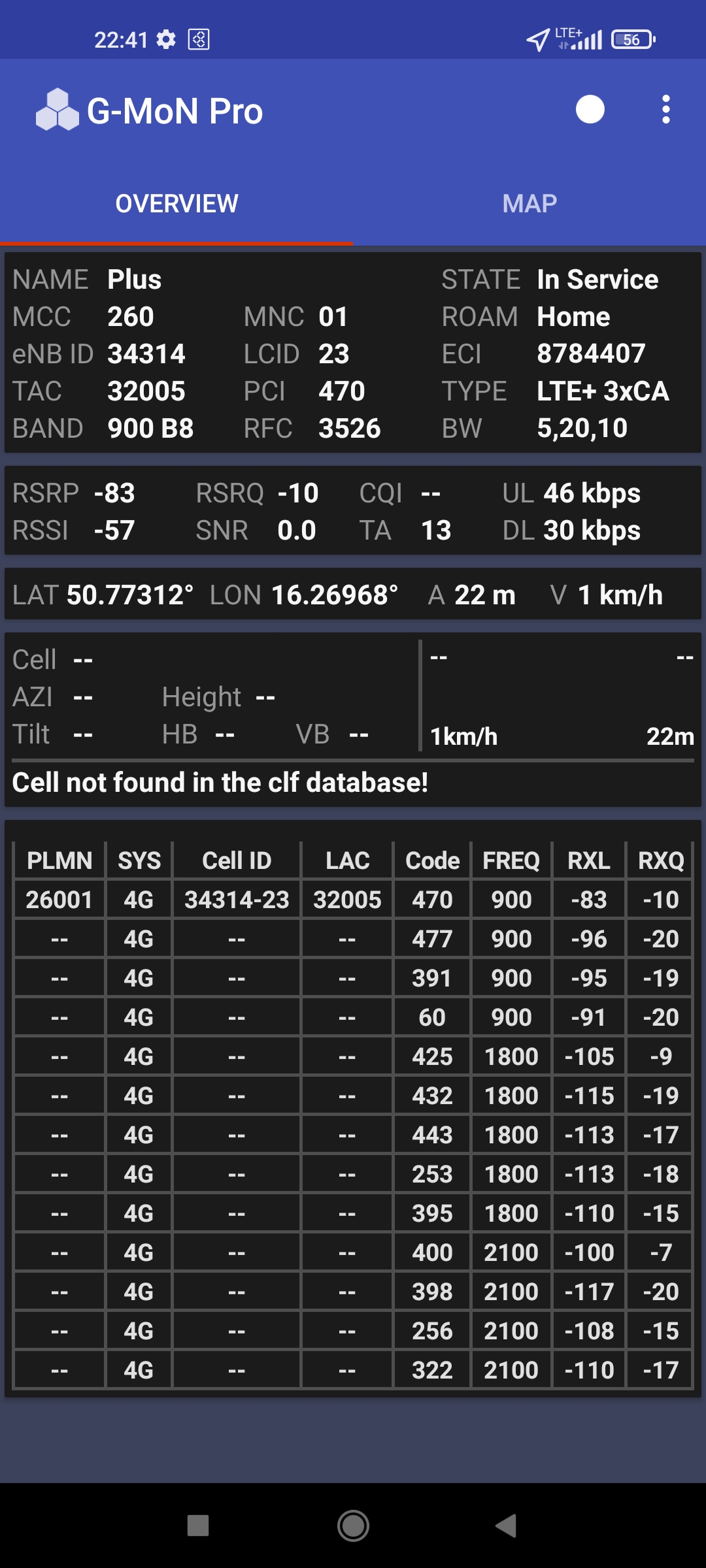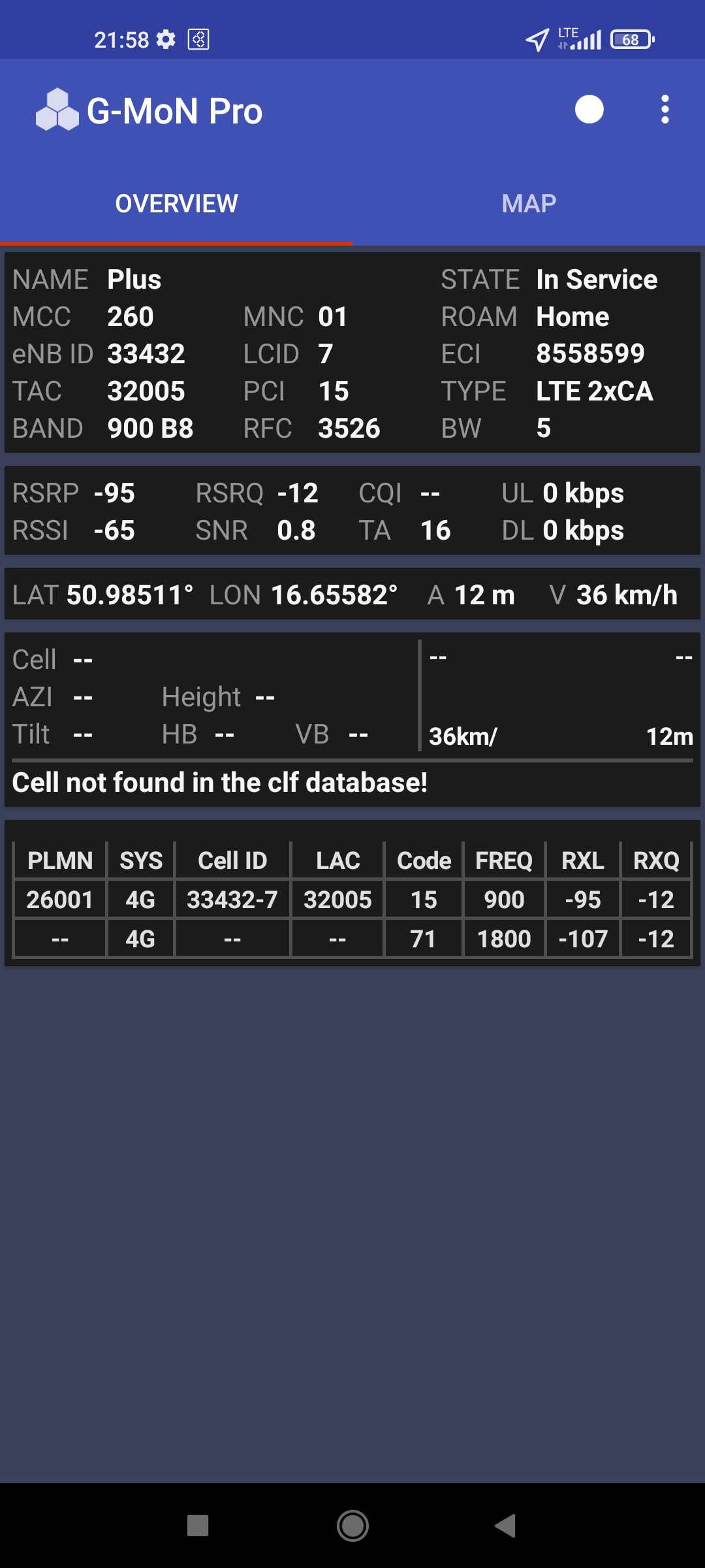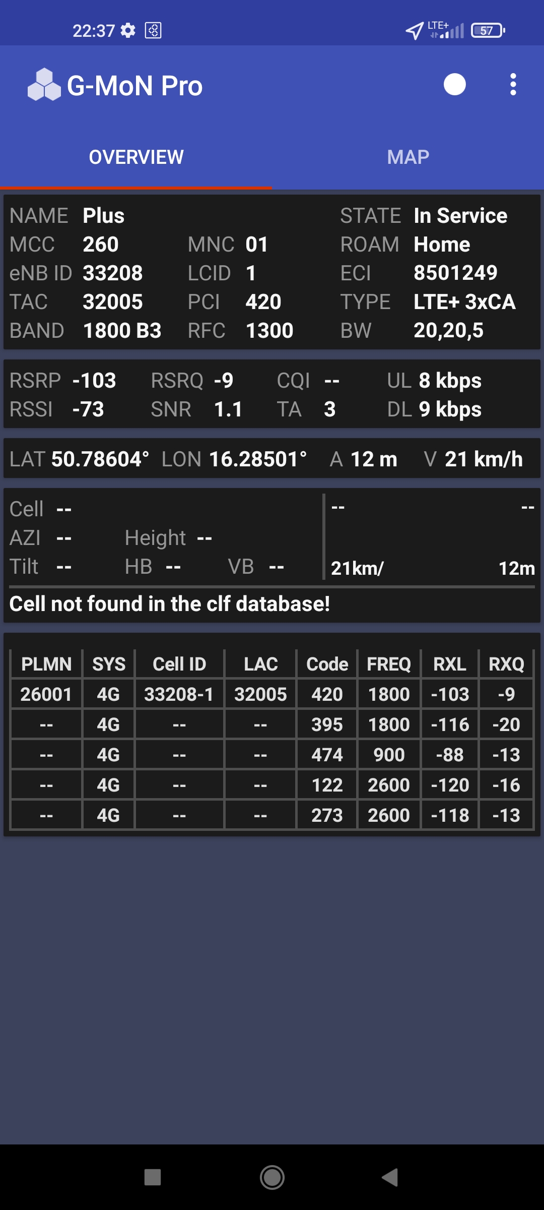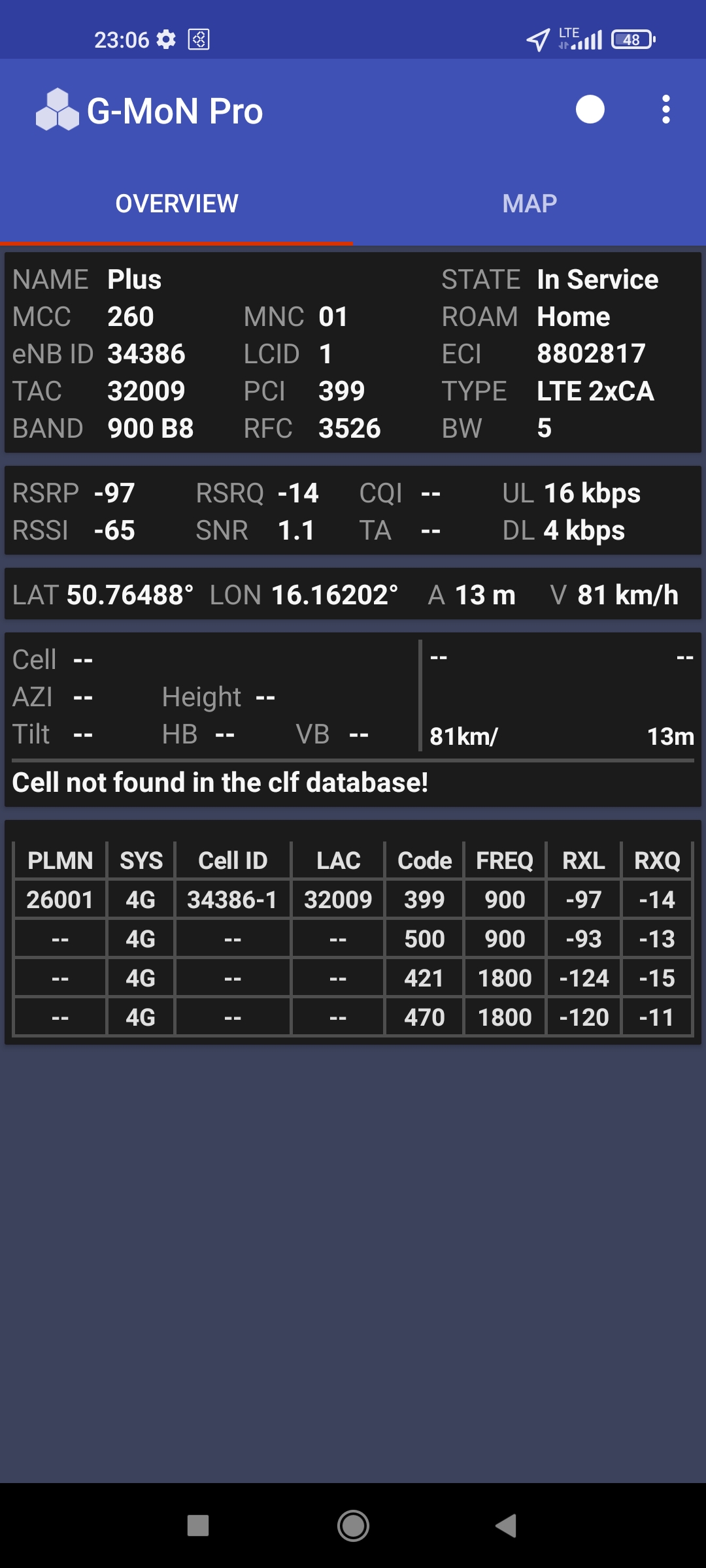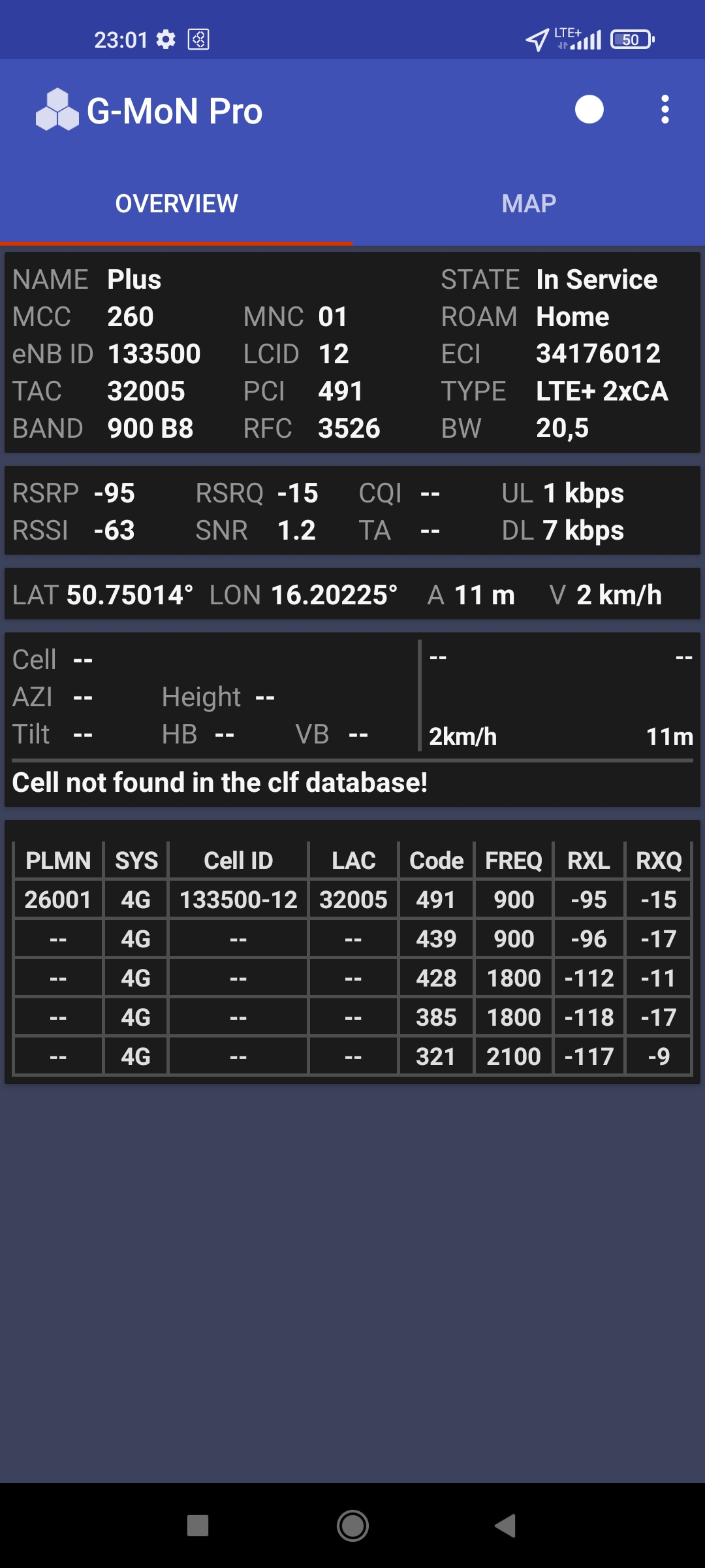 2. Wrocław Grabiszyn – mimo dostępnego sygnału i stacji bazowej z agregacją trzech nośnych transmisja danych stała. Prawdopodobny powód – przeciążona sieć, przeciążona stacja z powodu przejmowania na siebie ruchu ze stacji gorzej radiowo wyposażonych w sąsiedztwie