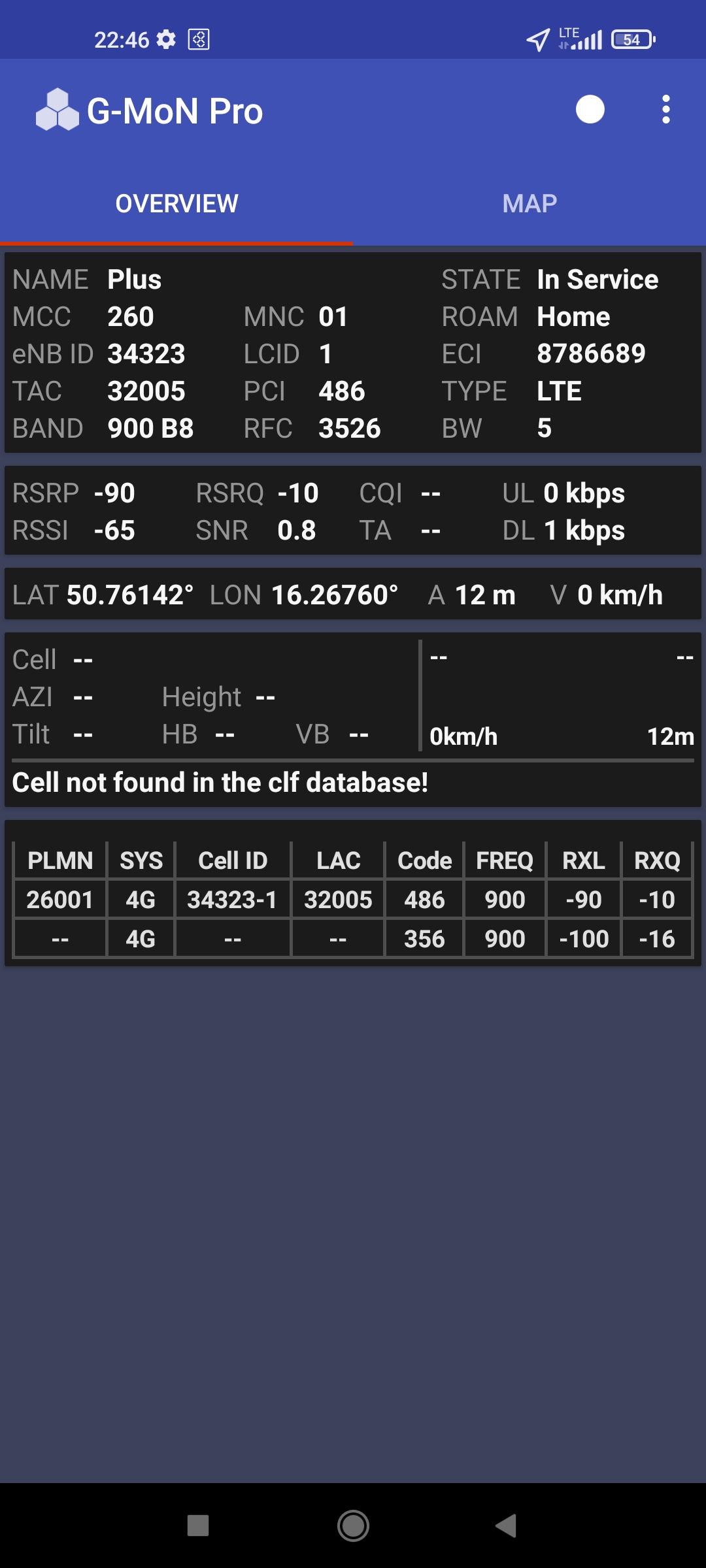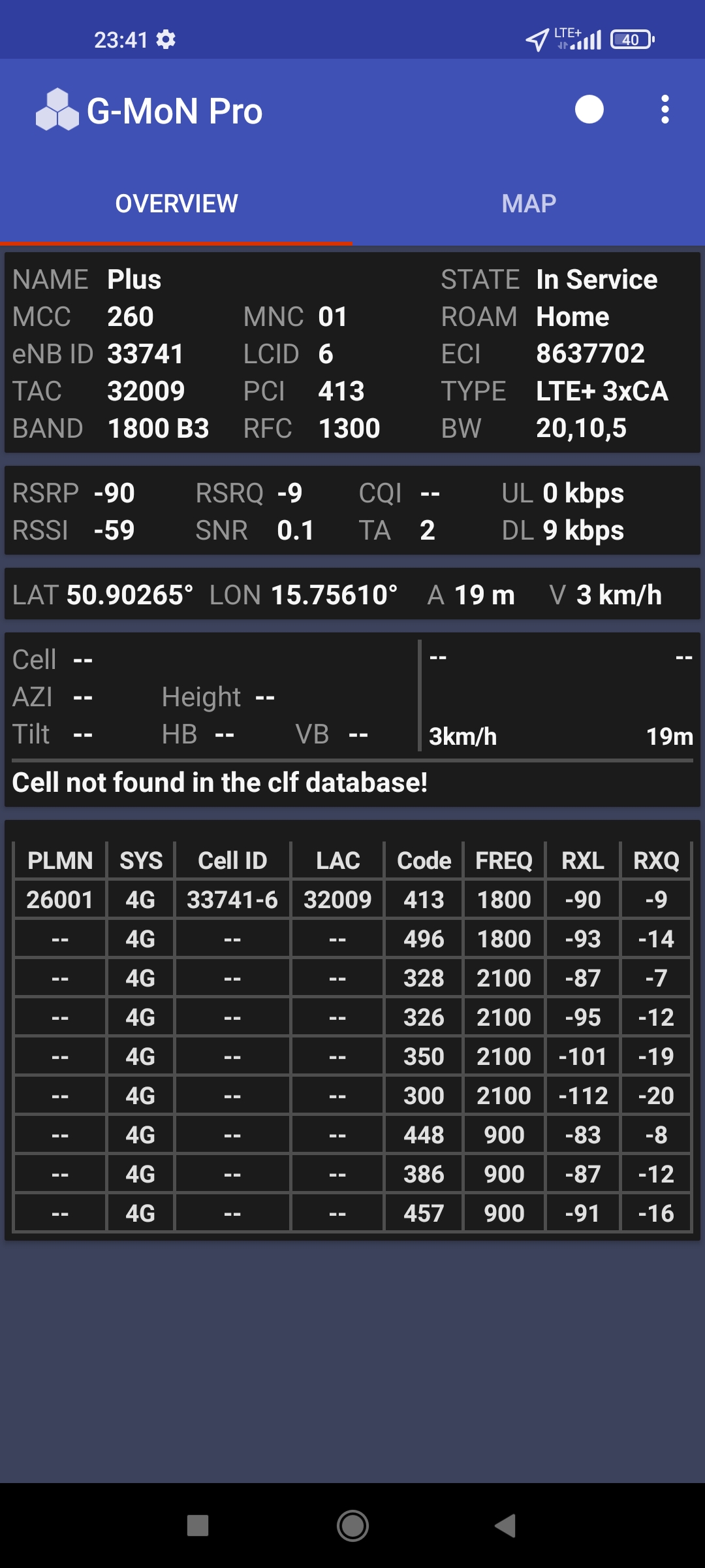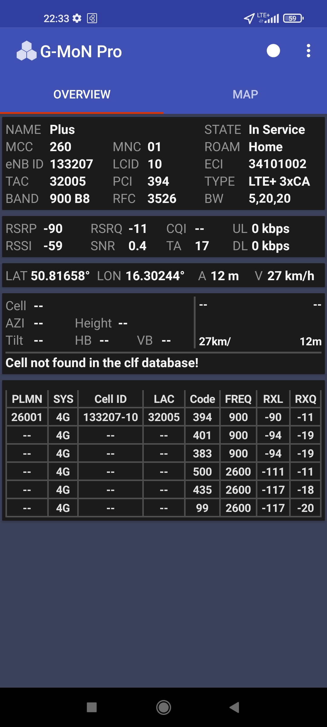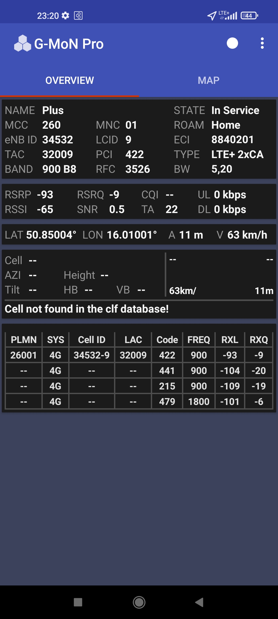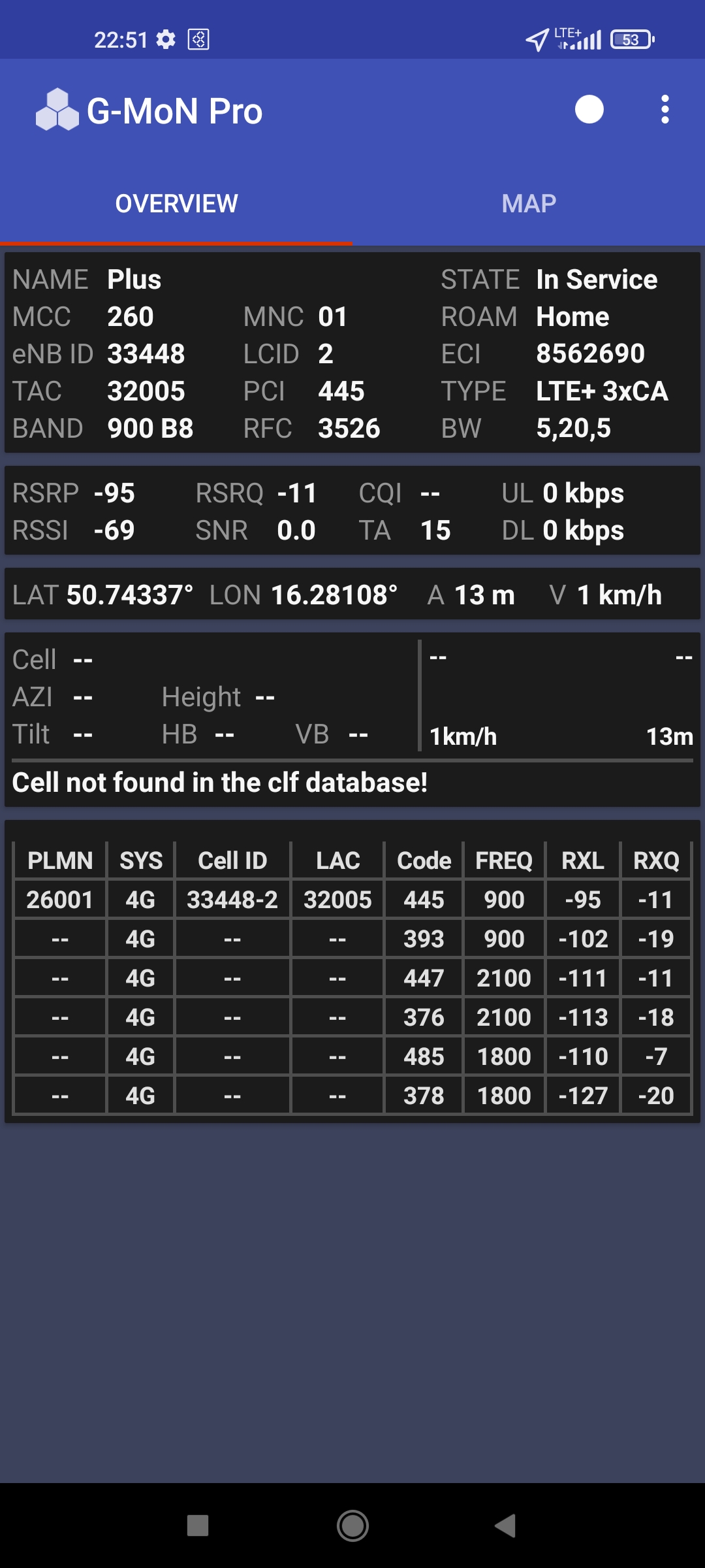 2. Wrocław Grabiszyn – mimo dostępnego sygnału i stacji bazowej z agregacją trzech nośnych transmisja danych stała. Prawdopodobny powód – przeciążona sieć, przeciążona stacja z powodu przejmowania na siebie ruchu ze stacji gorzej radiowo wyposażonych w sąsiedztwie