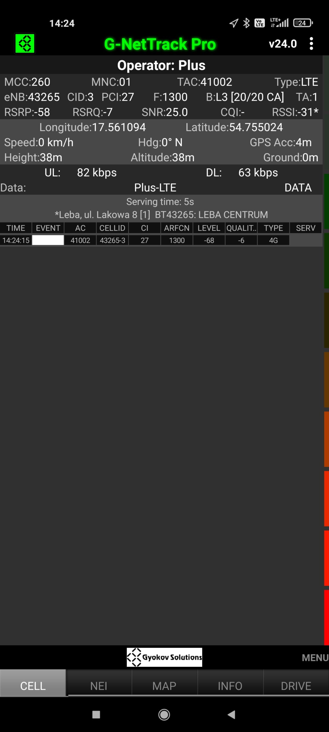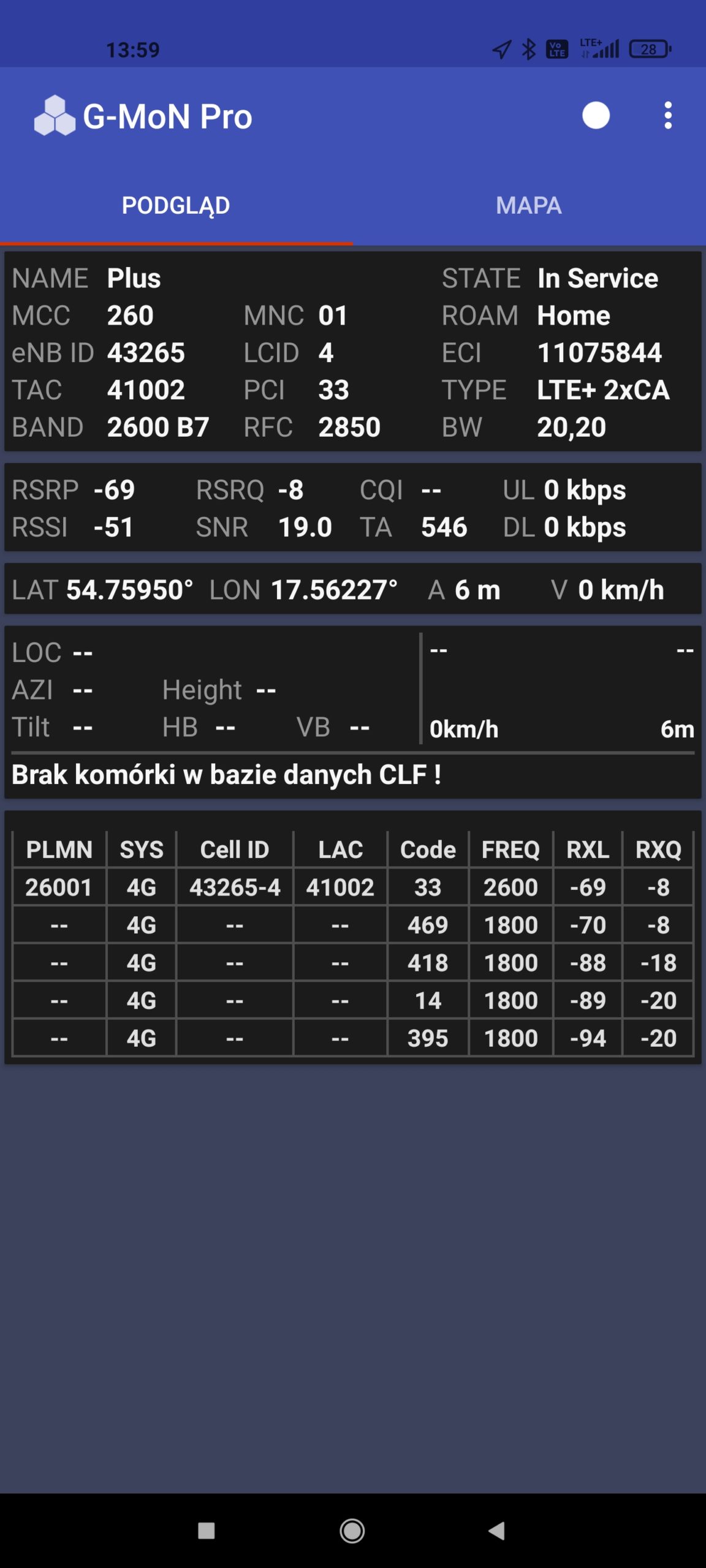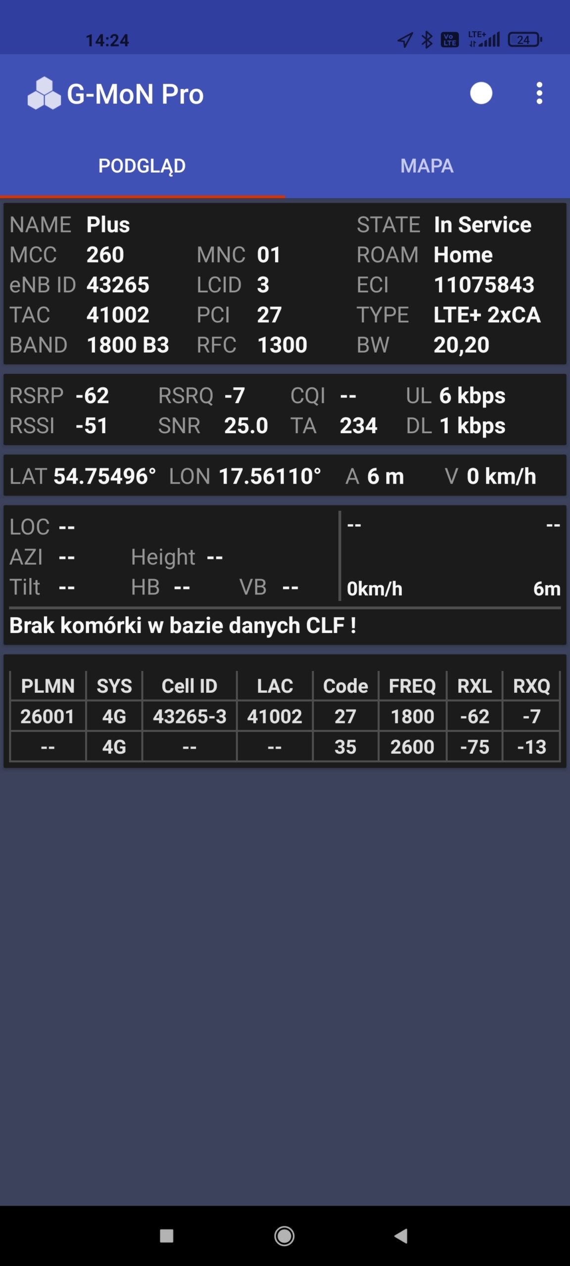Prezentujemy jakość transmisji danych ze stacji bazowej sieci Plus, zlokalizowanej przy ul. Łąkowej 8 w Łebie. Stacja oferuje klientom dla transmisji danych LTE, bez 5G. Konfiguracja jest na tyle specyficzna, że w 4G zobaczymy dwa pasma, ale w dość niepowszechnym schemacie agregacji pasm: 2x20MHz (LTE1800/LTE2600). Nie znajdziemy tutaj ani LTE900 ani LTE2100. Stacja pracuje w oparciu o trzy sektory. Od naszego Korespondenta z Zagłębia otrzymaliśmy testy, zrealizowane na sektorze drugim oraz trzecim. Kodowy numer stacji: BT-43265 Łeba Centrum. Jest to jedna ze stacji operatora w schemacie 40MHz, w której zastosowano system agregacji pasm LTE w uplinku. Klienci czekają na upowszechnienie rozwiązania. Jak się dowiadujemy, w momencie implementacji 5G w stacji – terminale nie mają możliwości wykorzystania agregacji pasm w LTE w uplinku, stąd w takich konfiguracjach stacji agregacja pasm uplink LTE nie jest implementowana