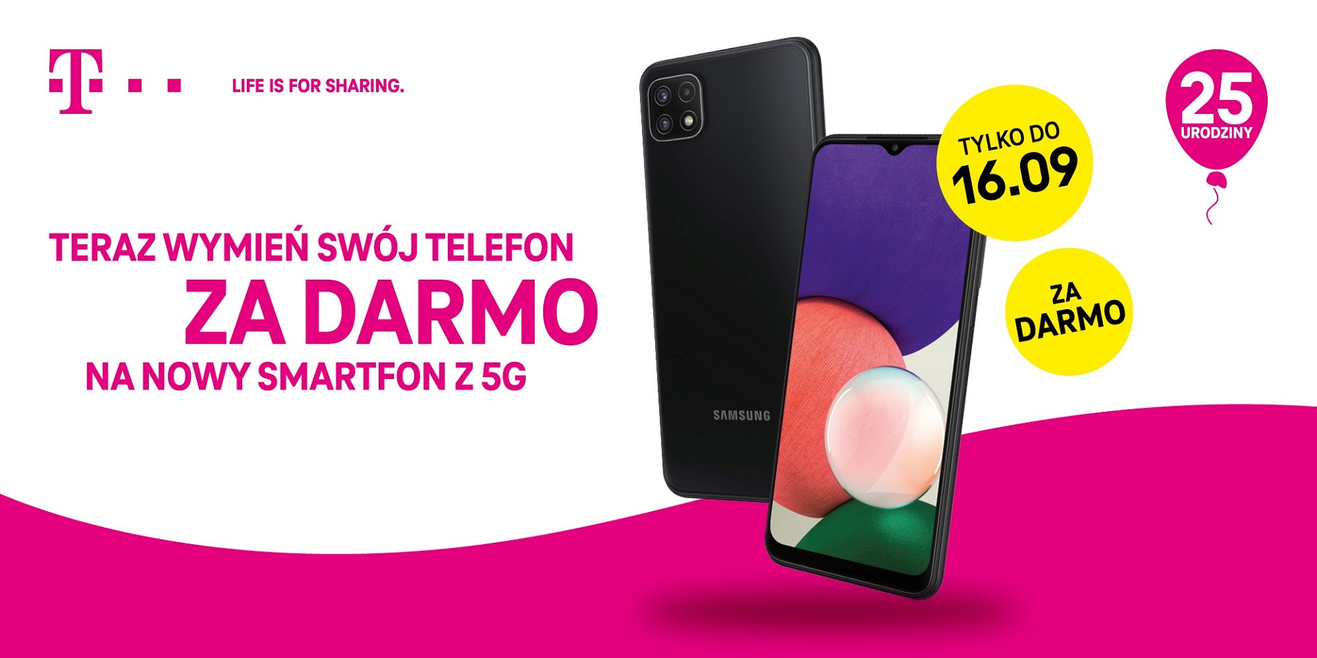 Moc życzeń, toasty, tort i… prezenty! Z okazji 25. urodzin T-Mobile w Polsce to my chcemy dawać naszym klientom jak najwięcej powodów do radości, bo to dzięki nim od 25 lat możemy rozwijać się na polskim rynku. Od ćwierćwiecza stawiamy też na nowe technologie i pamiętamy o ochronie klimatu. Właśnie dlatego w ramach specjalnej oferty „Urodziny z 5G” proponujemy klientom atrakcyjne i proekologiczne rozwiązanie. Tym, którzy zdecydują się oddać nam swój telefon i kontynuować z nami magentową podróż, przekażemy całkowicie za darmo nowy smartfon Samsung Galaxy A22 5G o wartości 1049 zł.