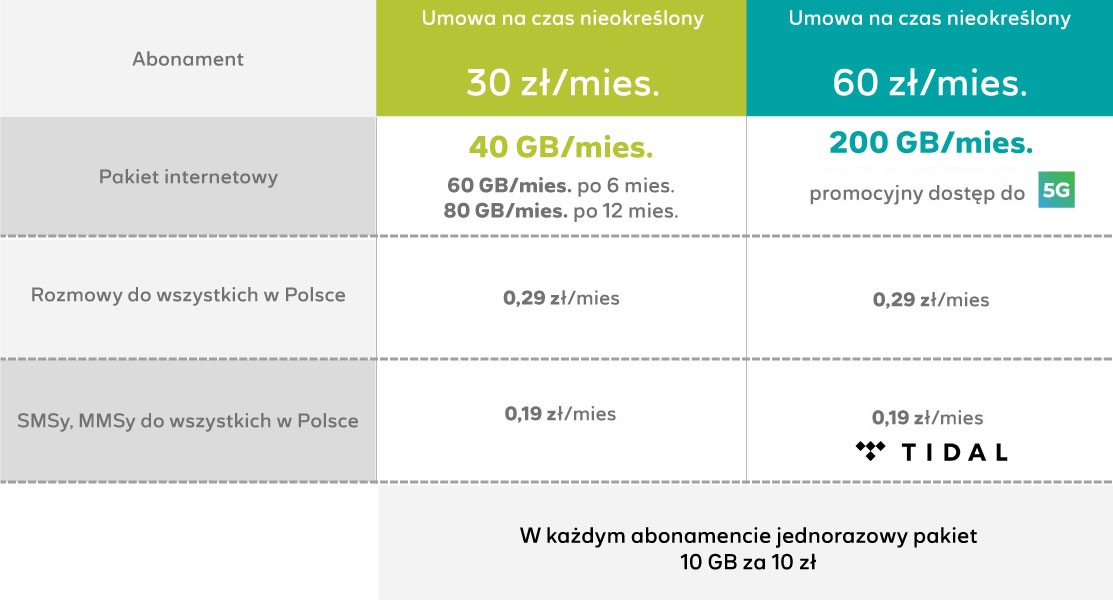 Osoby zainteresowane mniejszym pakietem danych w dalszym ciągu mogą skorzystać  z oferty za 30 zł/mies. z pakietem 40 GB/mies.  w umowie na czas nieokreślony. W przypadku tej oferty wielkość miesięcznego pakietu rośnie wraz z czasem umowy – po 6 miesiącach do wykorzystania jest 60 GB, a po 12 miesiącach 80 GB na miesiąc. Obydwie oferty – z abonamentem za 30zł/mies. i 60 zł/mies. – dostępne są zarówno w opcji sim only jak i ze sprzętem. W ofercie znajdują się laptopy, tablety, routery i inne urządzenia.