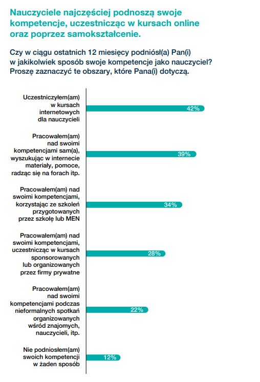 W ciągu ostatnich kilkunastu miesięcy przed pedagogami otworzyły się niespotykane wcześniej możliwości podnoszenia kwalifikacji zawodowych. Badani przez Nexerę nauczyciele najczęściej pogłębiali swoje kompetencje, uczestnicząc w kursach online oraz poprzez samokształcenie. 4 na 10 pedagogów zdobywało wiedzę w ten sposób. Zaledwie 1 na 10 ankietowanych nauczycieli w ogóle nie podniósł swoich kwalifikacji – wynika z Raportu #RegionyNEXERY2021. Z kolei według badania Centrum Cyfrowego, 76% nauczycieli w Polsce uzyskało wsparcie merytoryczne podczas nauczania zdalnego. Najczęściej było to wsparcie od innych nauczycieli ze szkoły, od dyrekcji, a także od innych pedagogów spoza szkoły. Według autorów raportu, grupy na Facebooku były przestrzenią, gdzie nauczyciele dzielili się między sobą ciekawymi materiałami i pomysłami, wykorzystywanymi na lekcjach.