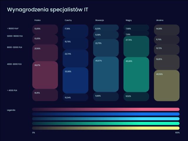 Według danych No Fluff Jobs, to specjaliści IT w Czechach zarabiają najwięcej spośród wszystkich biorących udział w badaniu – 33 proc. z nich otrzymuje wynagrodzenie powyżej 12 tys. zł netto. Z kolei 23 proc. zarabia pomiędzy 8 a 12 tys. zł netto, 34 proc. w granicach 4 do 8 tys. zł netto. W porównaniu z pozostałymi, ujętymi w badaniu krajami Europy Środkowo-Wschodniej, to właśnie w Czechach najmniejszy jest odsetek specjalistów IT zarabiających poniżej 4 tys. zł netto – jest ich zaledwie 10 proc. Jeśli chodzi o Polaków pracujących w branży IT, na zarobki powyżej 12 tys. zł netto liczyć może 26 proc. z nich. Nieco ponad 21 proc. deklaruje, iż ich zarobki kształtują się w przedziale od 8 do 12 tys. zł. Największą grupę stanowią jednak ci zarabiający od 4 do 8 tys. zł netto (36 proc.), a najmniejszą otrzymujący wynagrodzenia poniżej 4 tys. zł netto (16 proc.). Z kolei, w przypadku zarobków specjalistów IT z Ukrainy, zauważalne jest duże rozwarstwienie. Mimo iż zarobki powyżej 12 tys. złotych netto deklaruje tam niecałe 26 proc. z nich, a więc odsetek zbliżony do Polski i znacznie wyższy niż na Słowacji czy Węgrzech, to aż 40,5 proc. zarabia poniżej 4 tys. zł netto. Prawie 20 proc. badanych specjalistów IT na Ukrainie deklaruje, iż zarabia od 4 do 8 tys. zł netto, zaś niespełna 17 proc. od 8 do 12 tys. zł netto.