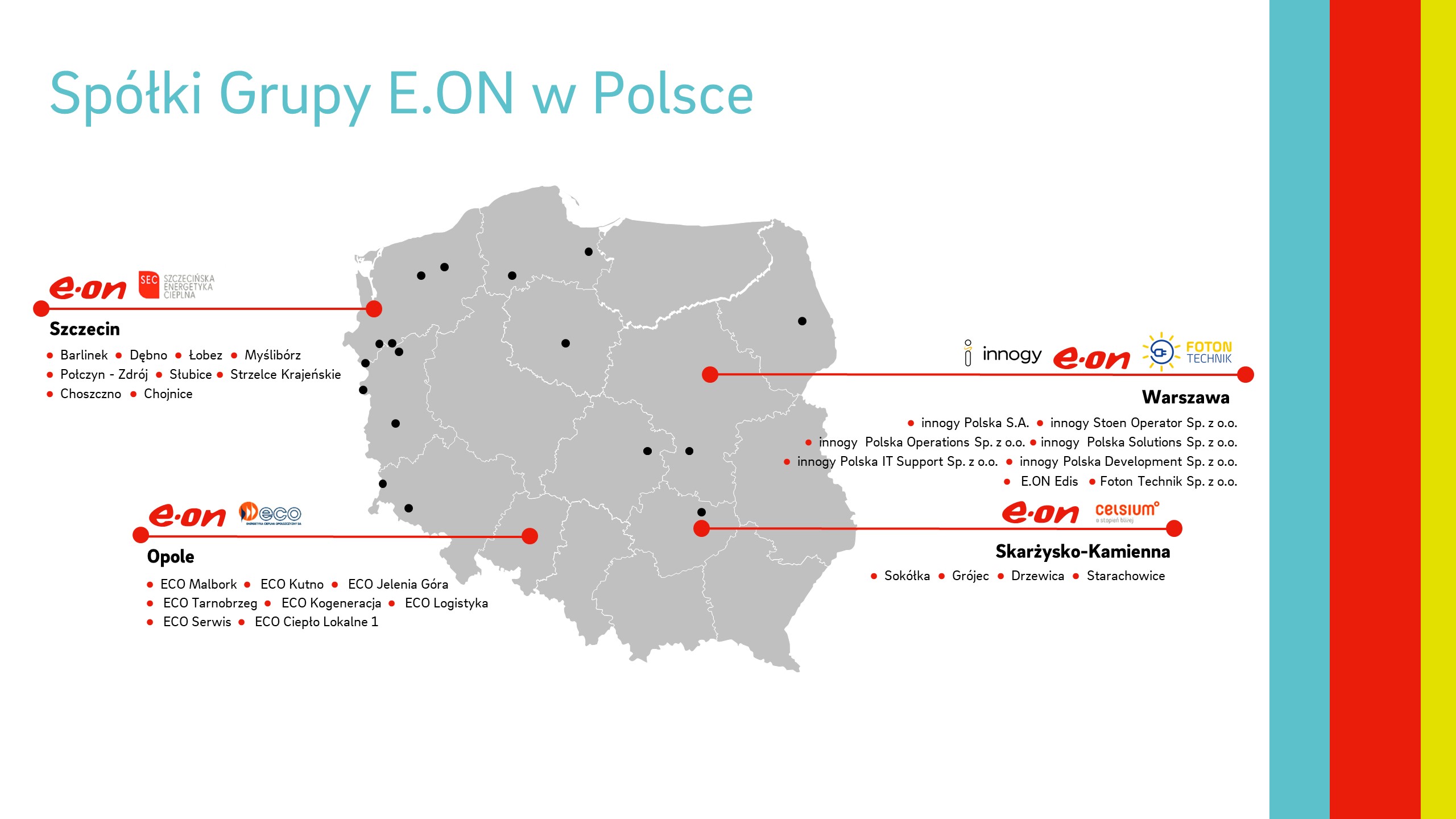 Spółki należące do Grupy E.ON działają w Polsce od 20 lat. Produkują oraz dystrybuują energię elektryczną, gaz, ciepło i chłód do klientów indywidualnych, sektora publicznego i klientów biznesowych na terenie całego kraju. Głównym rynkiem w obszarze sprzedaży energii elektrycznej jest Warszawa. W zakresie produkcji i dostaw ciepła głównymi rynkami działania są Szczecin i Opole. Firma zapowiada dalszy rozwój innowacyjnych, wzajemnie uzupełniających się produktów i usług dla klientów. Planuje także dalsze inwestycje w nowoczesną infrastrukturę energetyczną w Polsce, mając jednocześnie na uwadze uwarunkowania gospodarcze jak i potrzeby społeczności lokalnych. Pełna integracja z E.ON to naturalny krok w rozwoju  naszej firmy. Grupa E.ON oferuje dedykowane rozwiązania dla klientów i jako jeden z wiodących operatorów sieci w Europie odegra istotną rolę w tak ważnej dla  wszystkich transformacji energetyki.